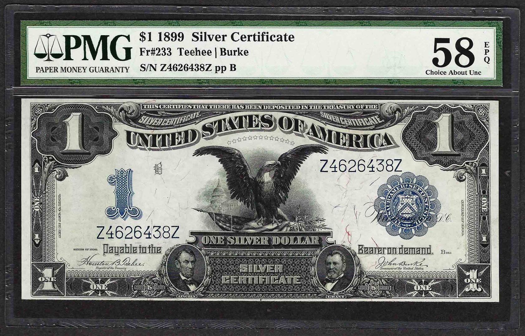 One 1899 $1 Black Eagle Silver Certificate Note PMG Choice About Uncirculated 58EPQ. PMG Certified.