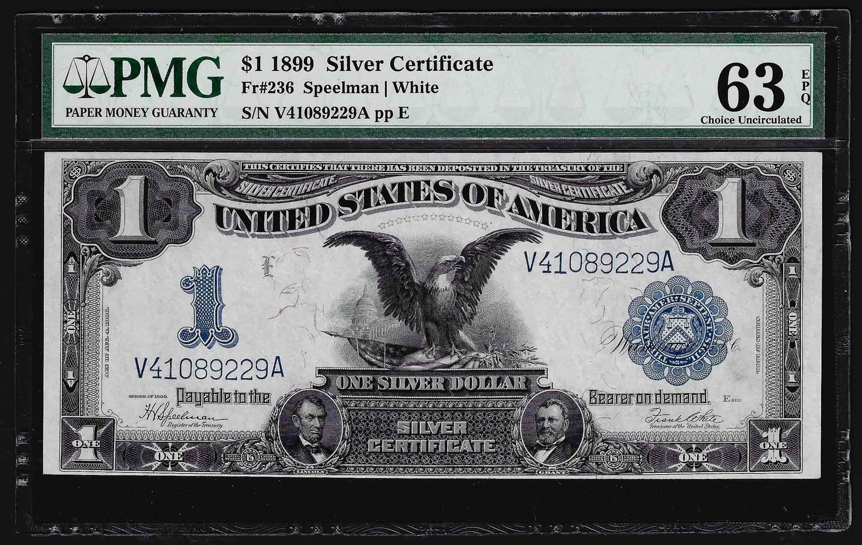 One 1899 $1 Black Eagle Silver Certificate PMG Choice Uncirculated 63EPQ. PMG Certified.