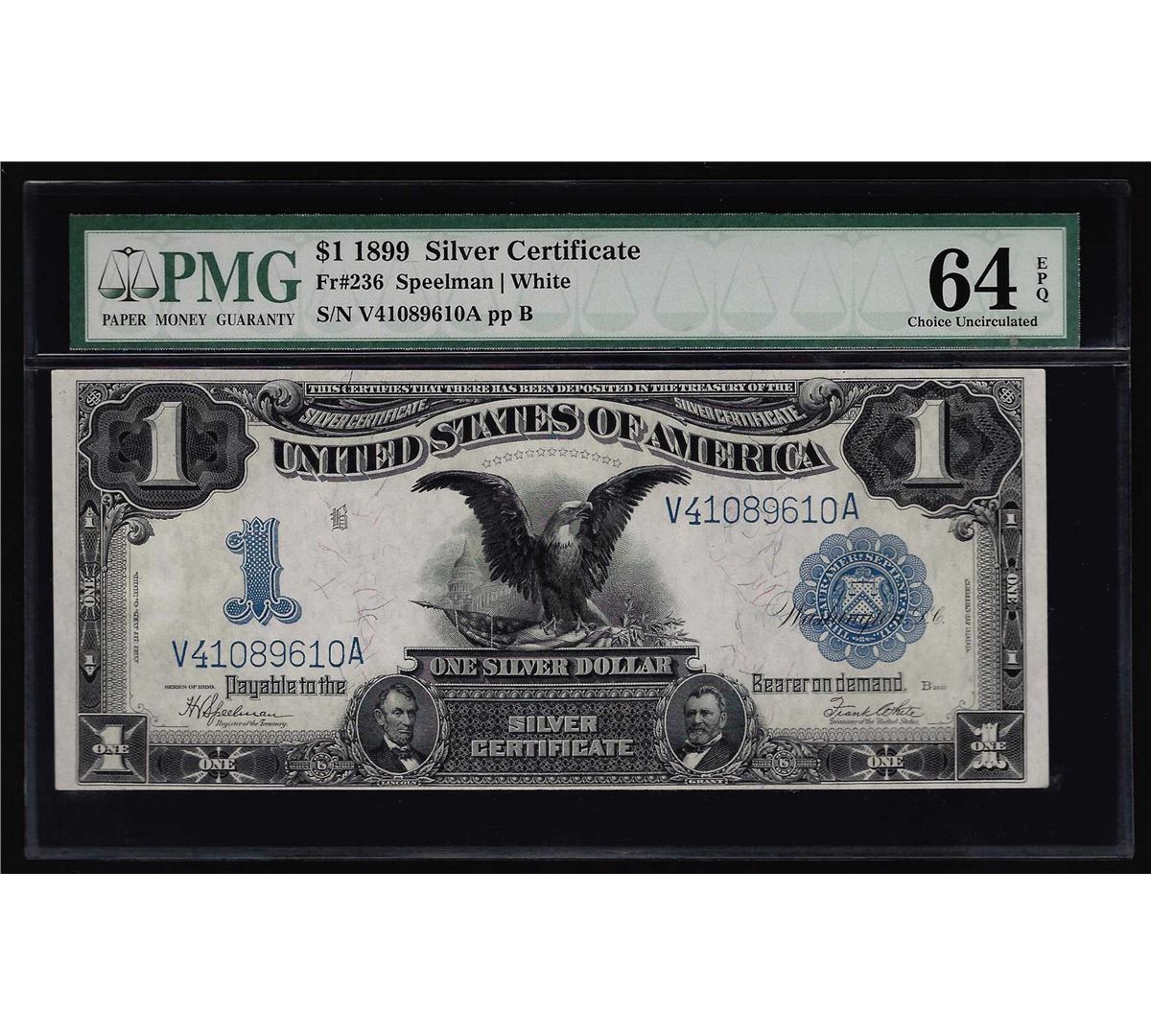 One 1899 $1 Black Eagle Silver Certificate PMG Graded CU64 EPQ. PMG Certified.