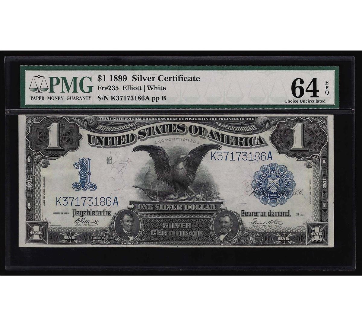One 1899 $1 Black Eagle Silver Certificate PMG Graded CU64 EPQ. PMG Certified.