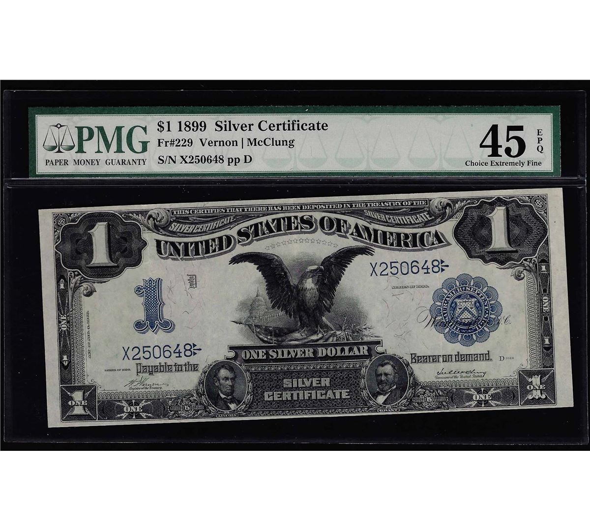 One 1899 $1 Black Eagle Silver Certificate PMG XF 45EPQ. PMG Certified.