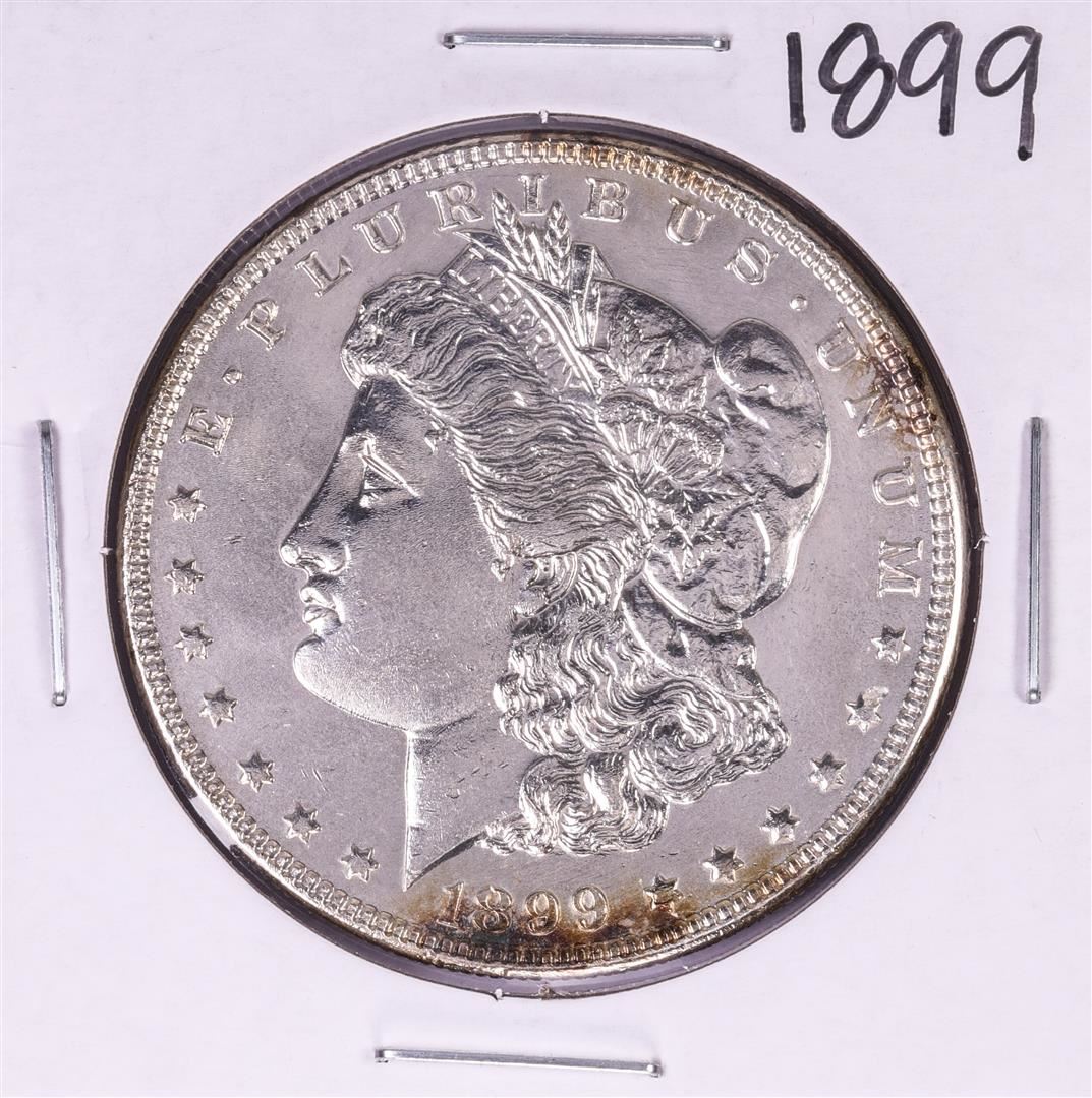 One 1899 $1 Morgan Silver Dollar Coin.