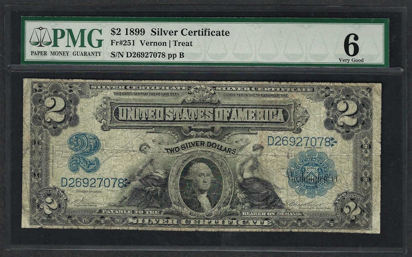 One 1899 $2 Mini Porthole Silver Certificate Note Fr.251 PMG Very Good 6. PMG Certified.