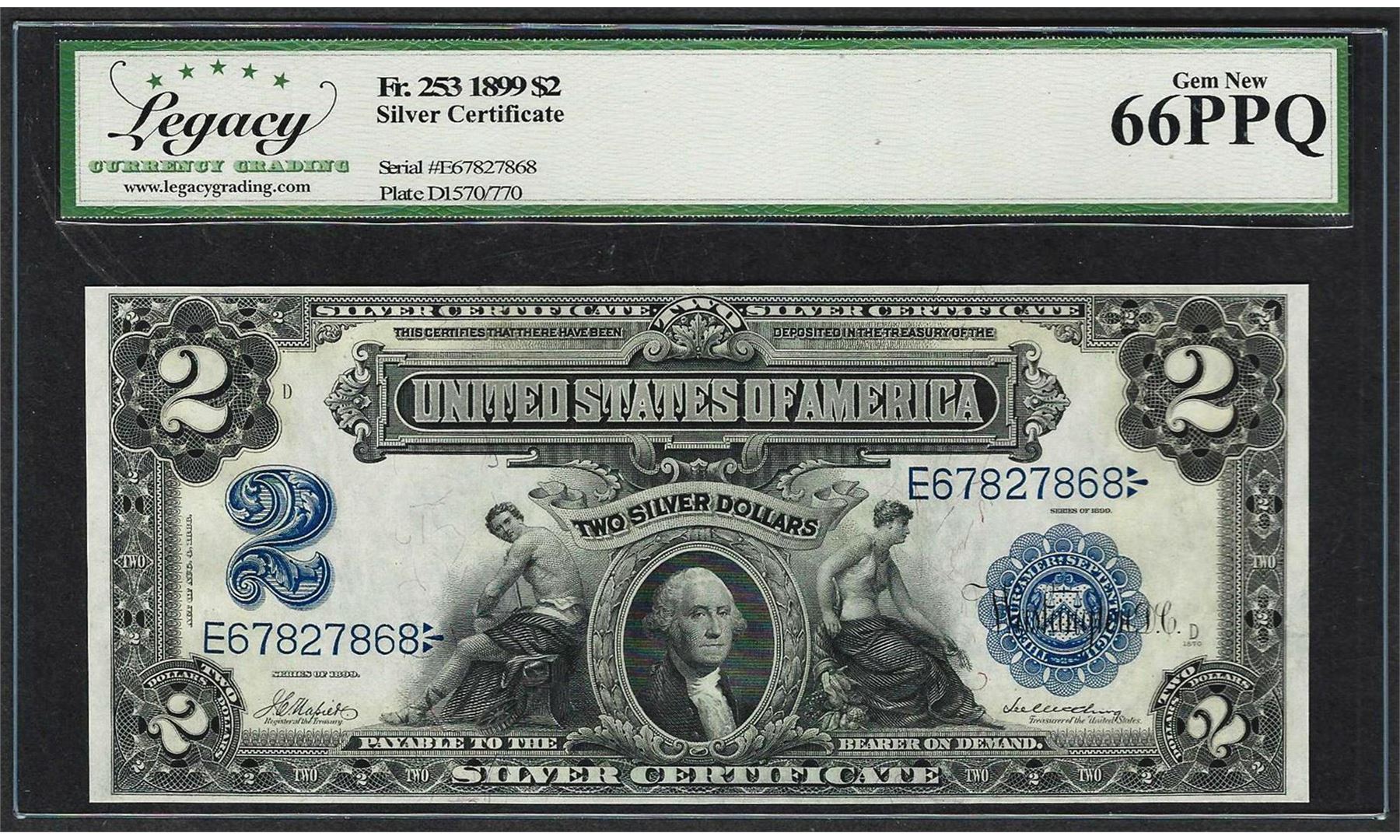 One 1899 $2 Mini-Porthole Silver Certificate Note Fr.253 Legacy Gem New 66PPQ.