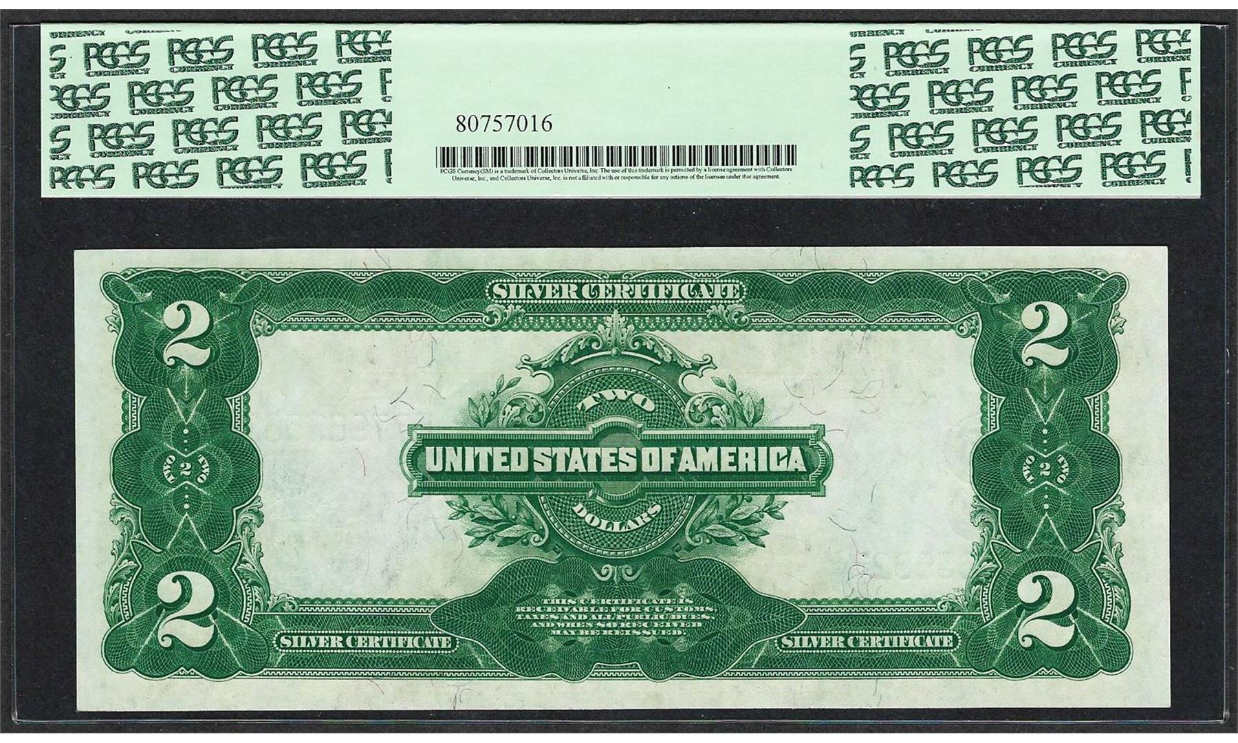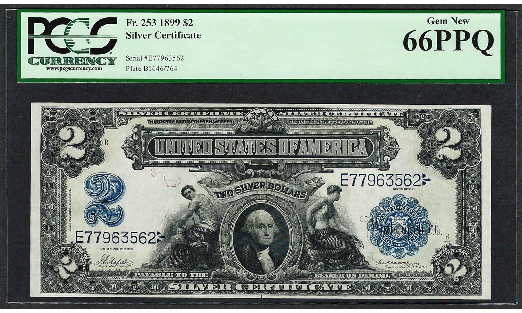 One 1899 $2 Mini-Porthole Silver Certificate Note Fr.253 PCGS Gem New 66PPQ. PCGS Graded.