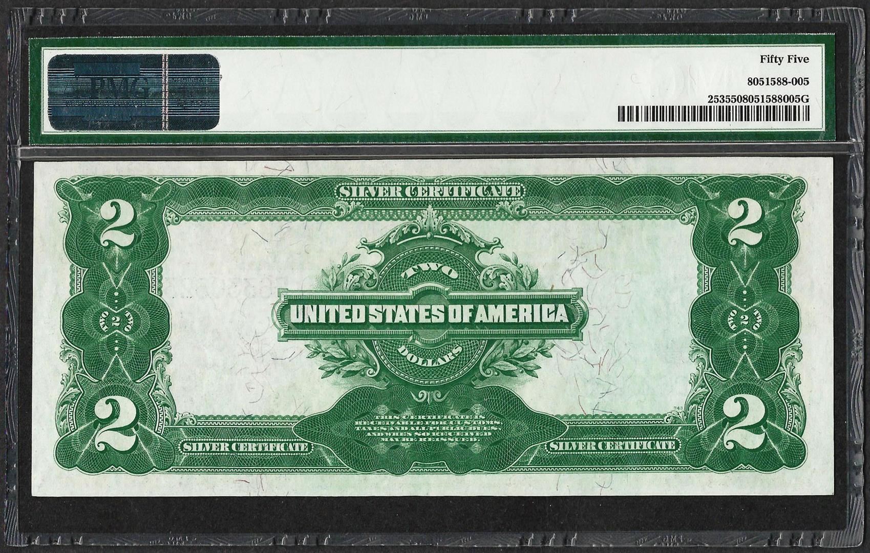 One 1899 $2 Mini-Porthole Silver Certificate Note Fr.253 PMG About Uncirculated 55. PMG Certified.