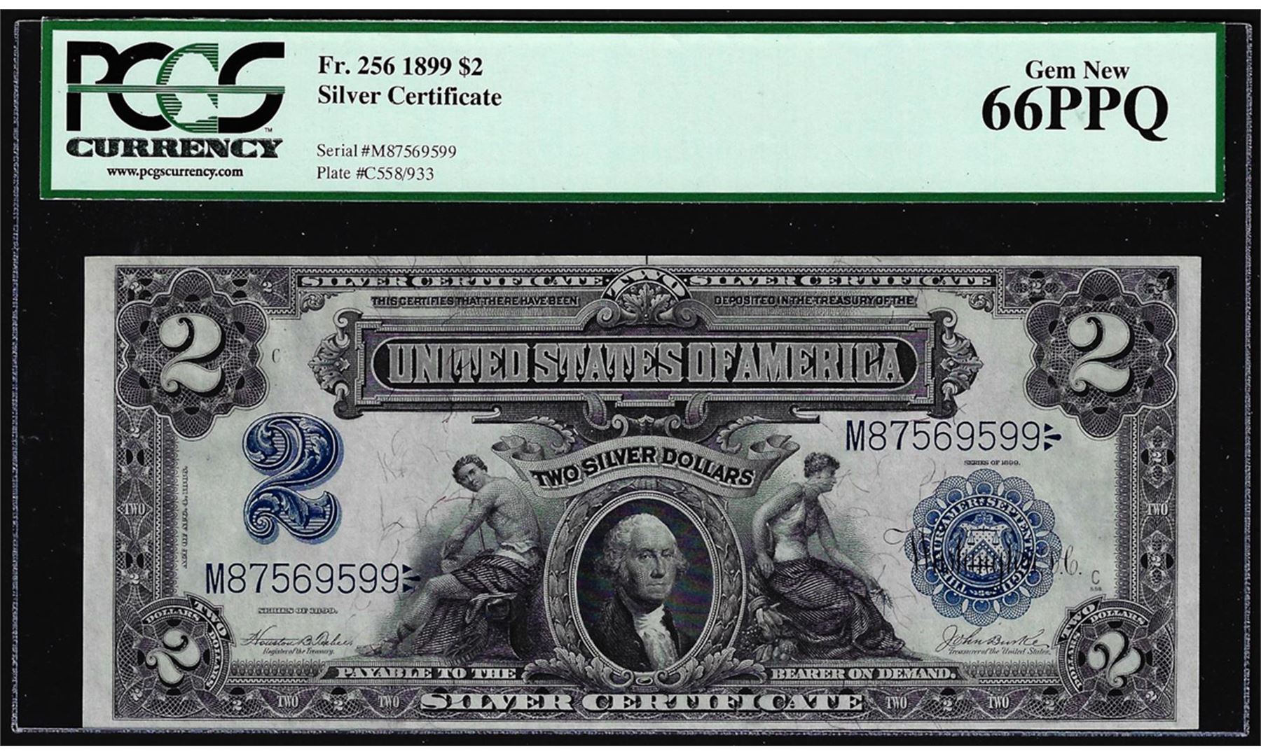 One 1899 $2 Mini-Porthole Silver Certificate Note Fr.256 PCGS Gem New 66PPQ. PCGS Graded.