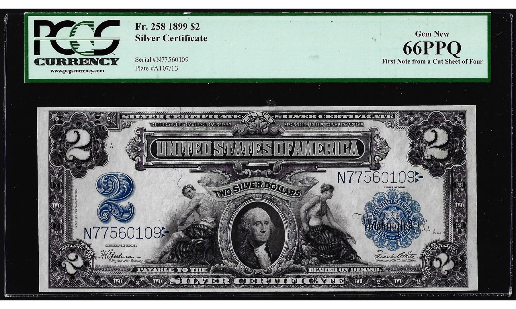 One 1899 $2 Mini-Porthole Silver Certificate Note Fr.258 PCGS Gem New 66PPQ. PCGS Graded.