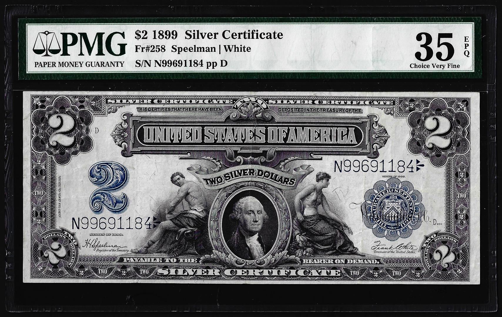 One 1899 $2 Mini-Porthole Silver Certificate Note Fr.258 PMG Choice Very Fine 35EPQ. PMG Certified.