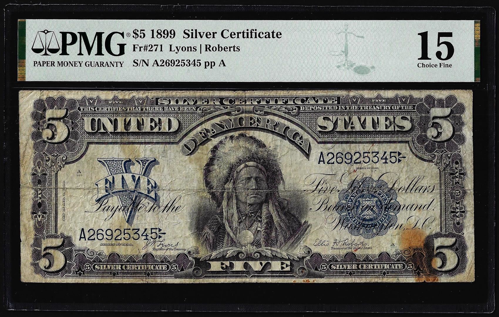 One 1899 $5 Indian Chief Silver Certificate Note Fr.271 PMG Choice Fine 15. PMG Certified.