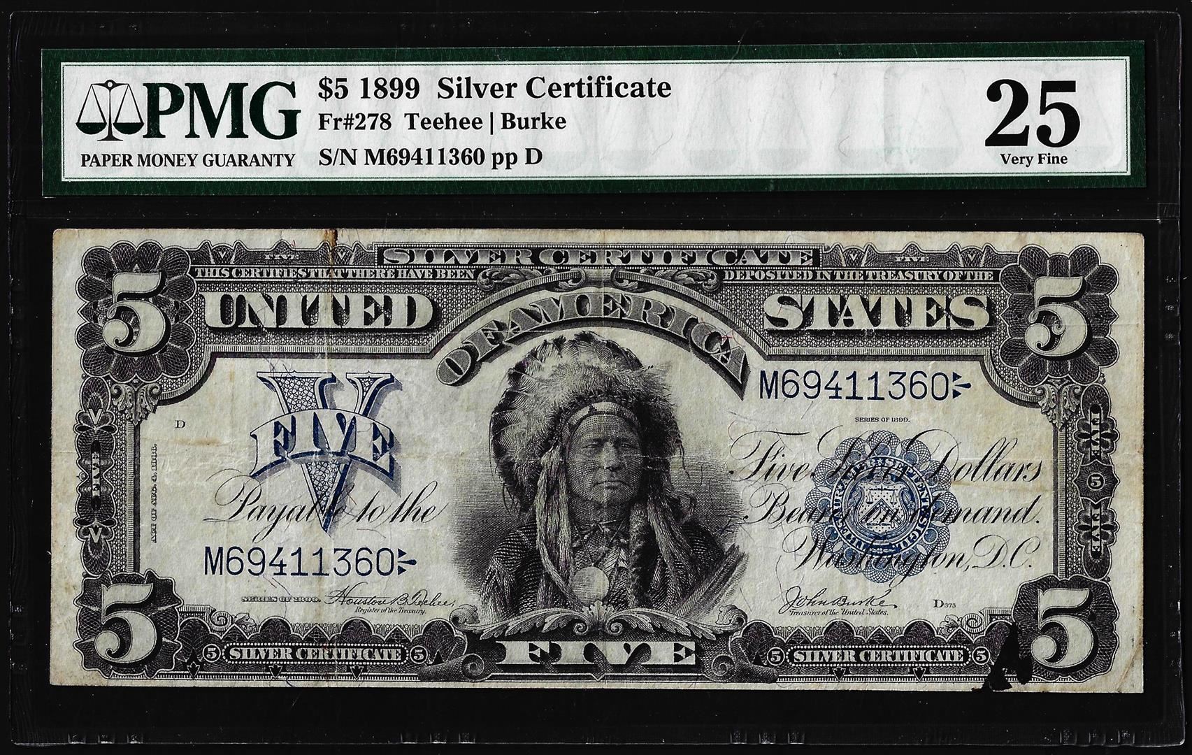 One 1899 $5 Indian Chief Silver Certificate Note Fr.278 PMG Very Fine 25. PMG Certified.