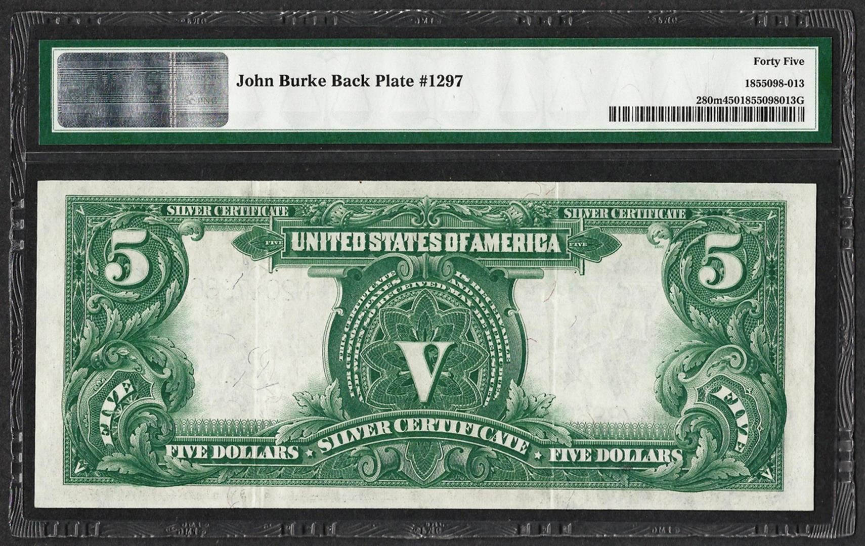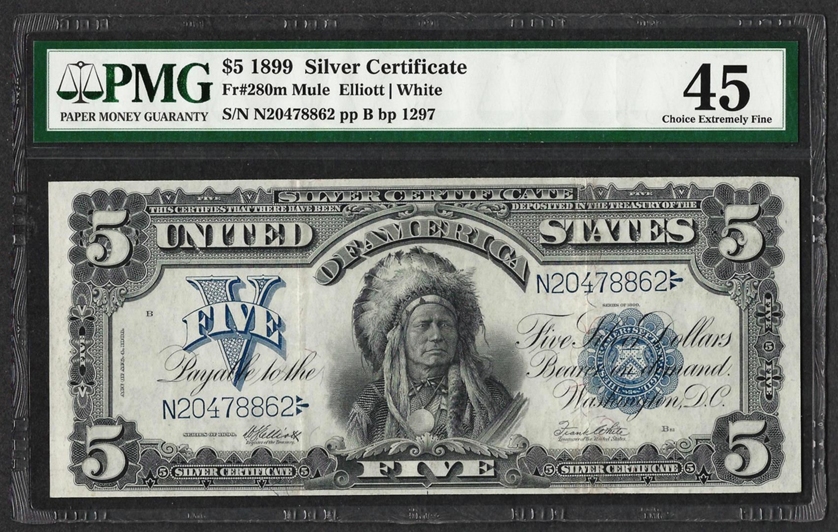 One 1899 $5 Indian Chief Silver Certificate Note Fr.280m PMG Extremely Fine 45. PMG Certified.