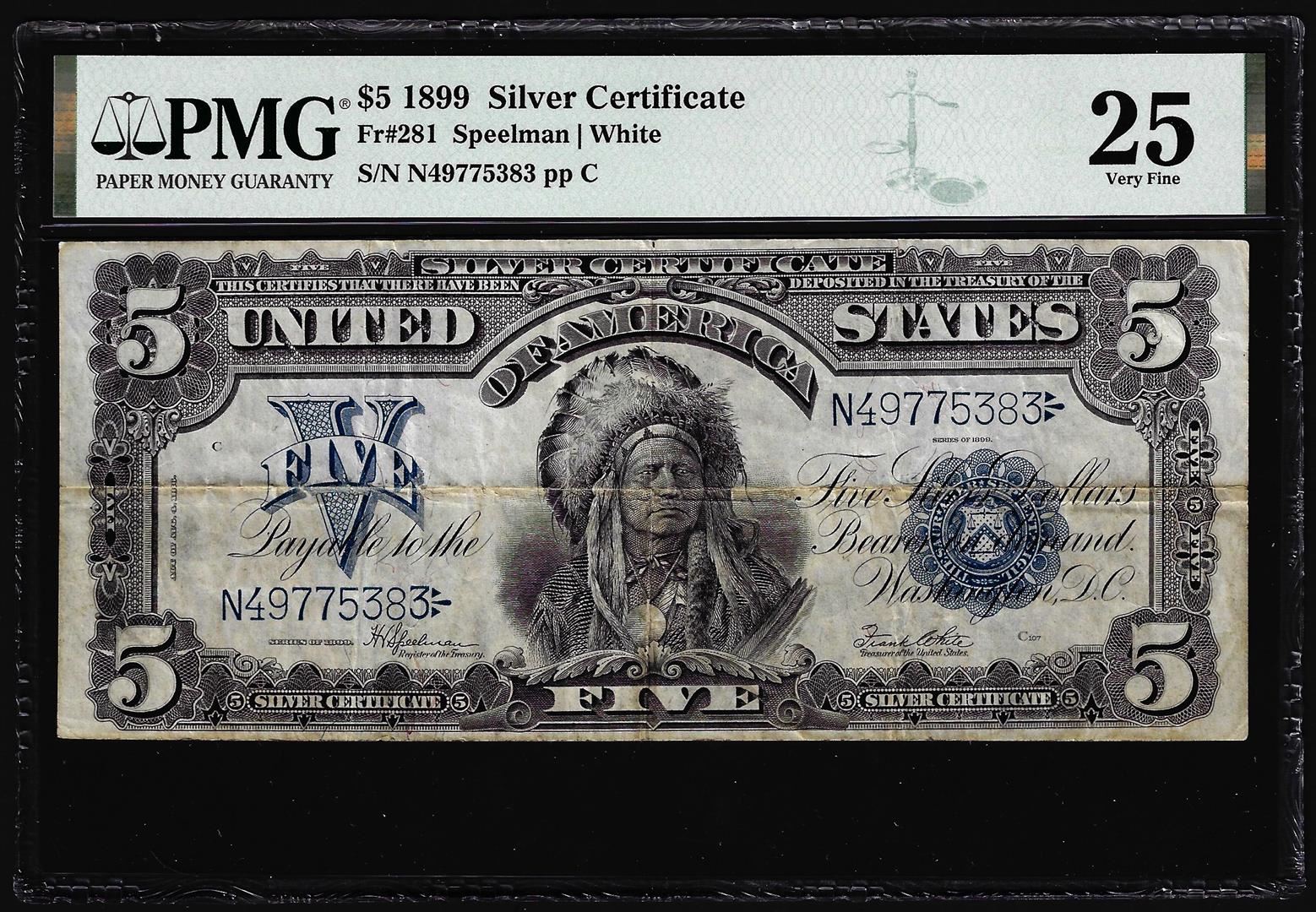 One 1899 $5 Indian Chief Silver Certificate Note Fr.281 PMG Very Fine 25. PMG Certified.