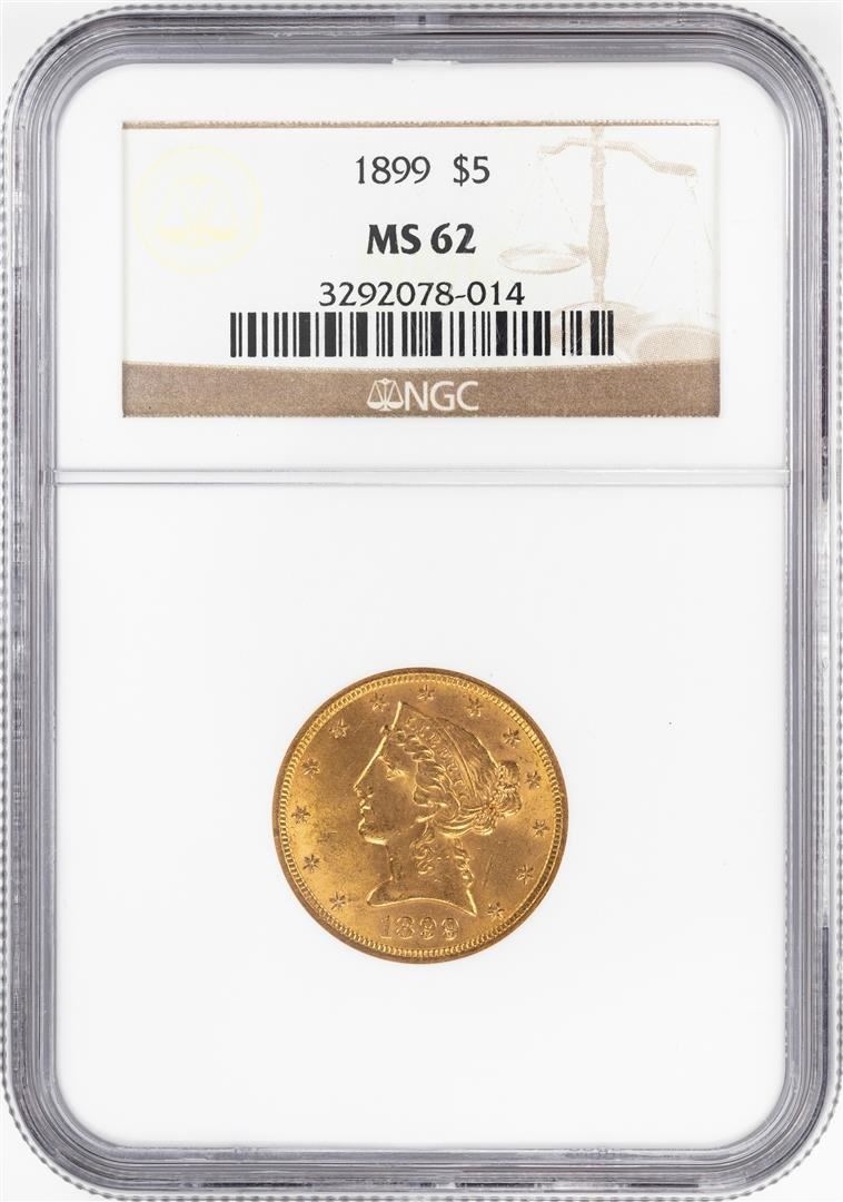 One 1899 $5 Liberty Head Half Eagle Gold Coin NGC MS62. NGC Certified.