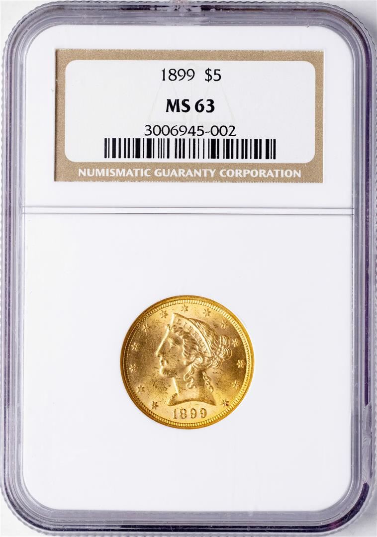 One 1899 $5 Liberty Head Half Eagle Gold Coin NGC MS63. NGC Certified.