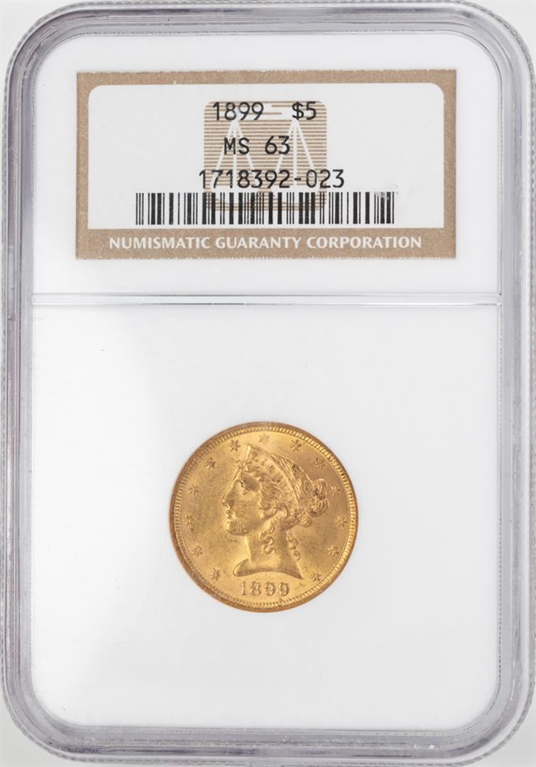 One 1899 $5 Liberty Head Half Eagle Gold Coin NGC MS63. NGC Certified.