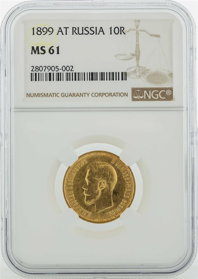 One 1899-AT Russia 10 Roubles Gold Coin NGC MS61. NGC Certified.