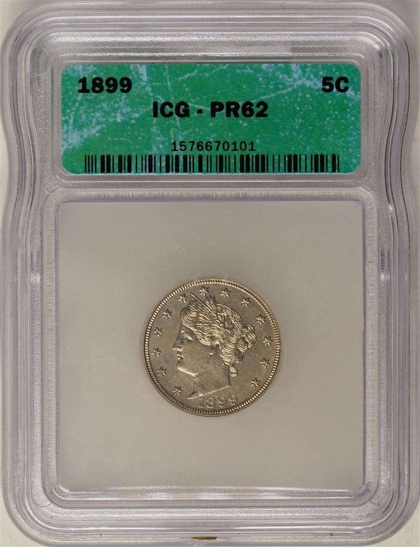 One 1899 Proof Liberty V Nickel Coin ICG PR62. ICG Certified.