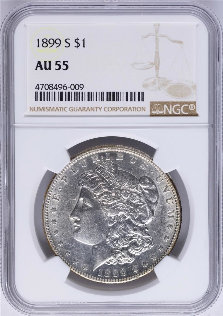 One 1899-S $1 Morgan Silver Dollar Coin NGC AU55. NGC Certified.