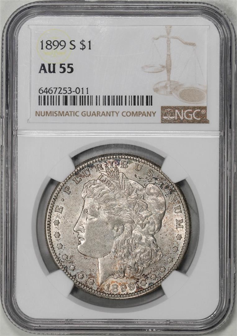 One 1899-S $1 Morgan Silver Dollar Coin NGC AU55. NGC Certified.