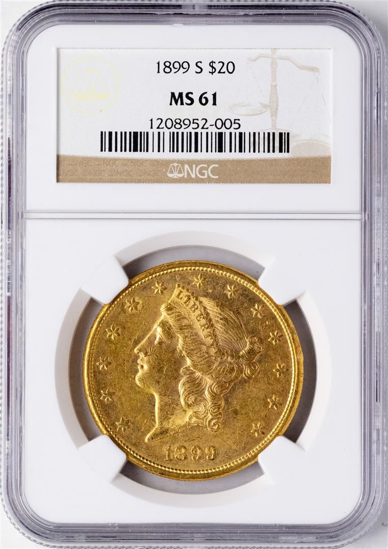 One 1899-S $20 Liberty Head Double Eagle Gold Coin NGC MS61. NGC Certified.