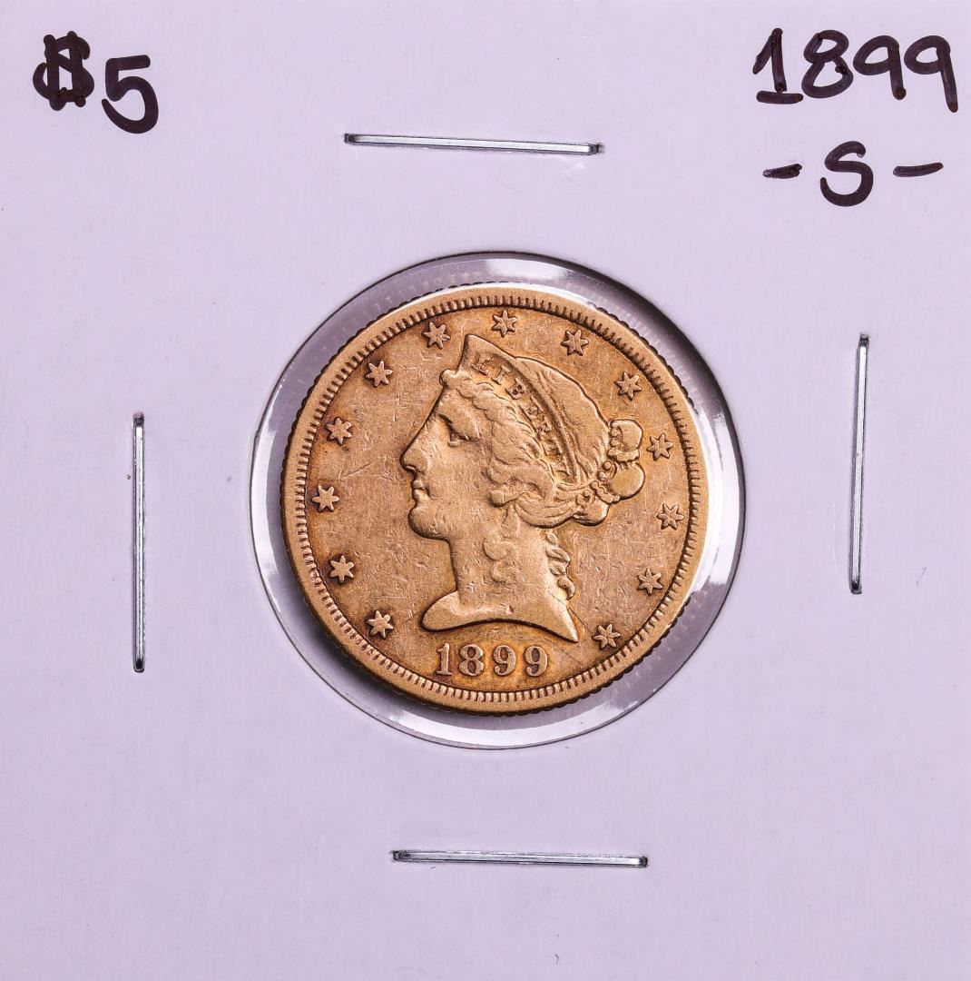 One 1899-S $5 Liberty Head Half Eagle Gold Coin.
