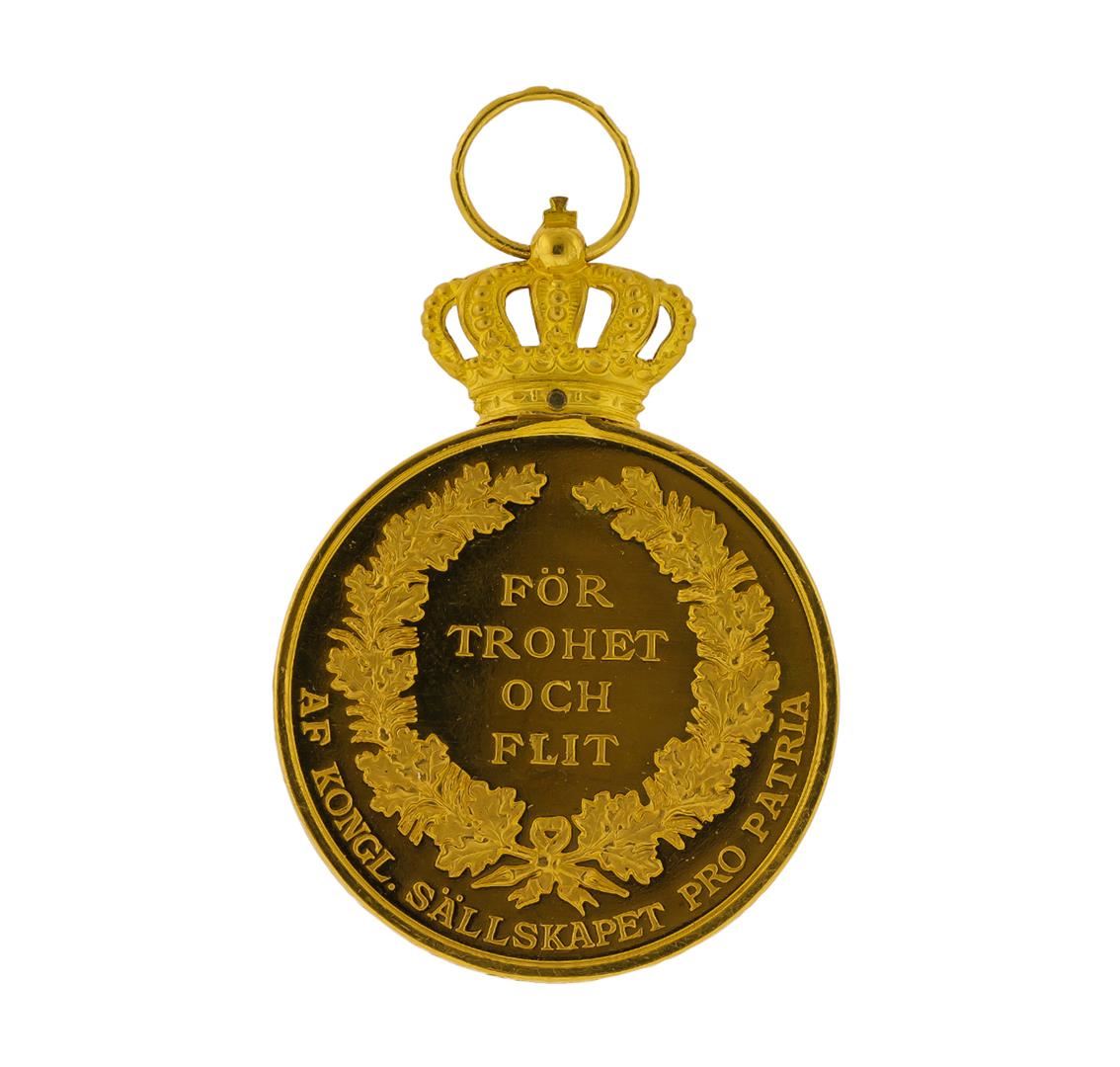 One 18K Gold 33mm Sweden Gustafv Royal Faithful Service Medal. Enscribed translation "For Fidelity & Diligence" to John Olsson. The total weight of this medal is 29.4 grams of 18K Gold.