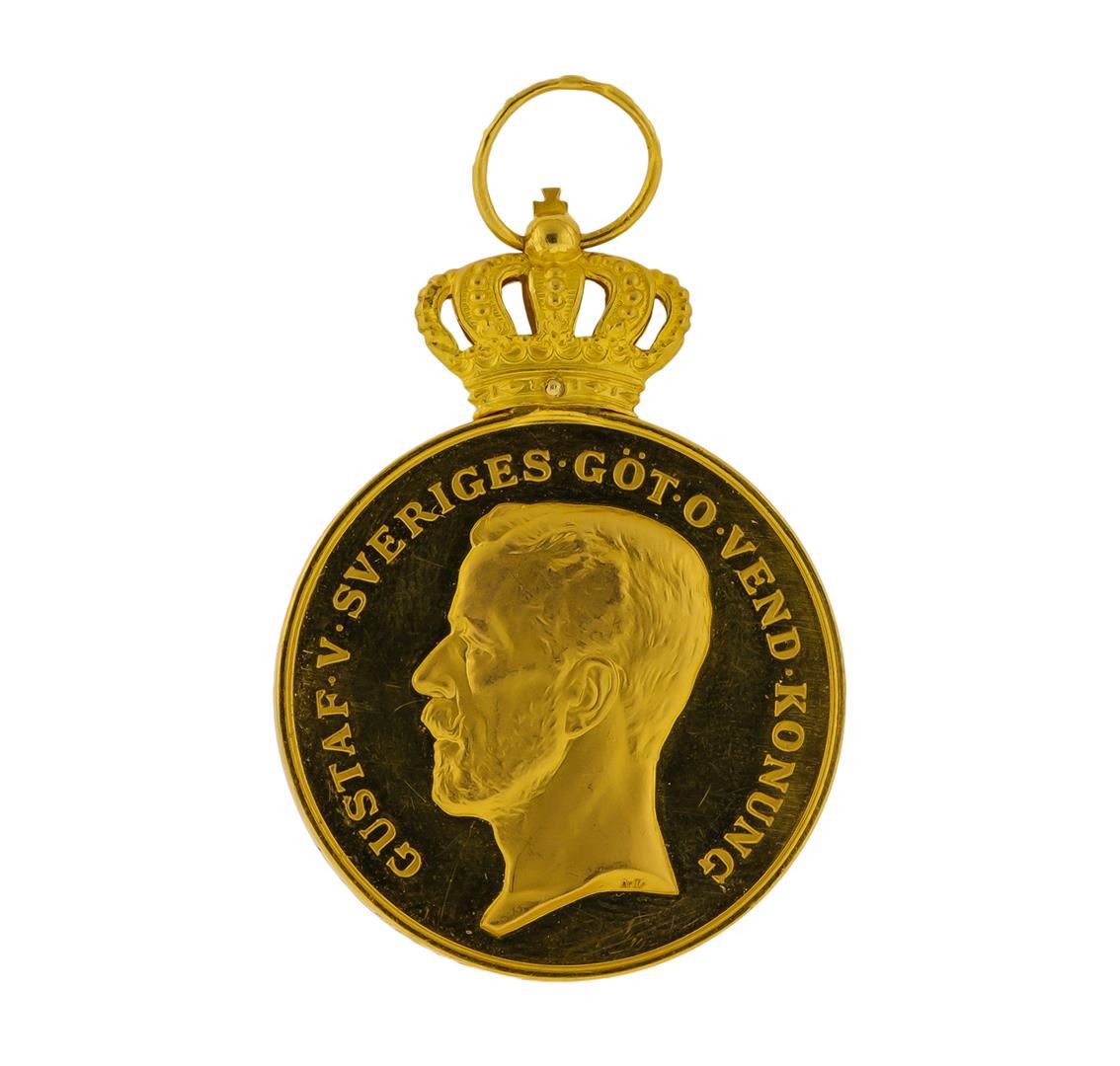 One 18K Gold 33mm Sweden Gustafv Royal Faithful Service Medal. Enscribed translation "For Fidelity & Diligence" to John Olsson. The total weight of this medal is 29.4 grams of 18K Gold.