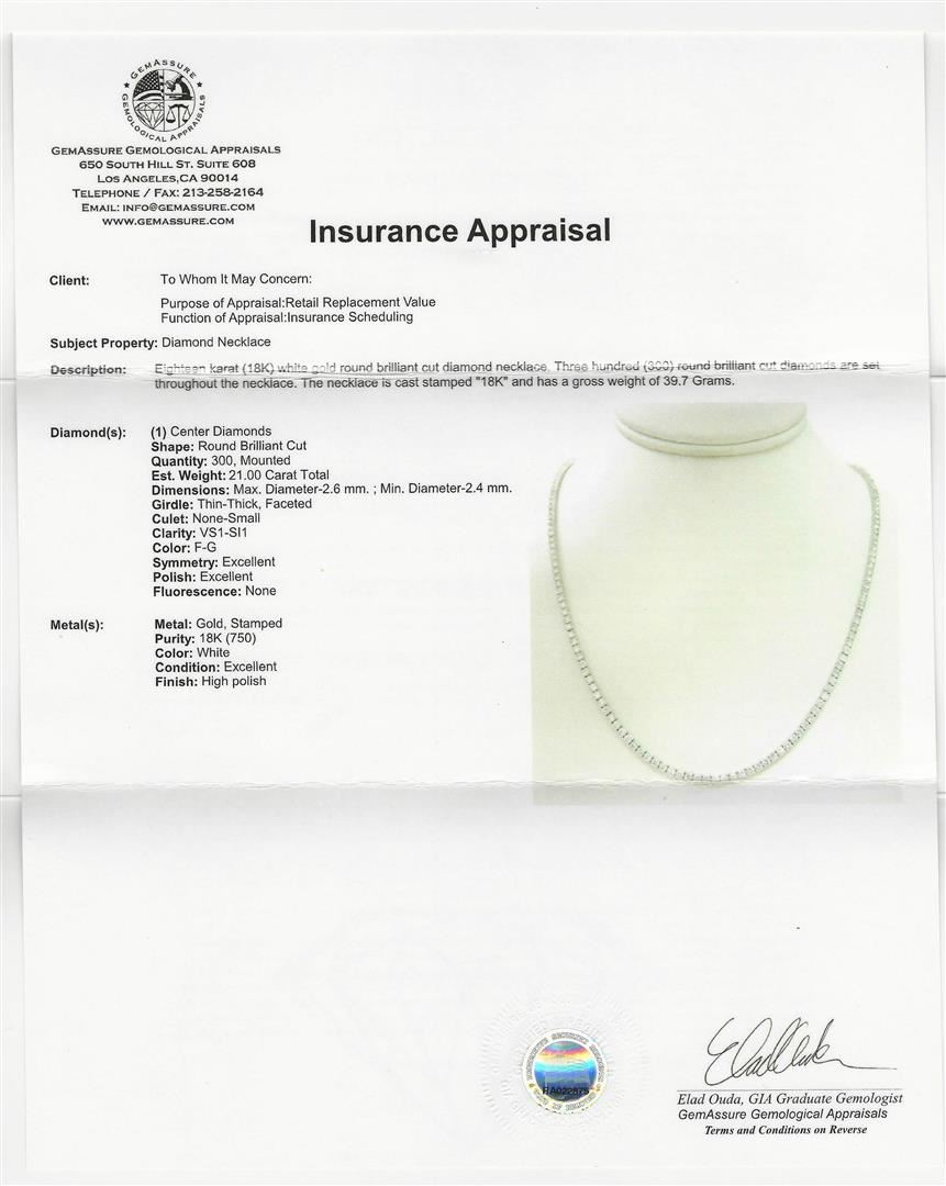 One 18K White Gold Round brilliant cut diamond tennis necklace. Containing (300) round brilliant cut diamonds with a total approximate weight of 21.00 cts., Clarity: VS1-SI1, Color: F-G. The necklace is cast stamped "18K" and has a gross weight of 39.7 grams. GGA Appraised.