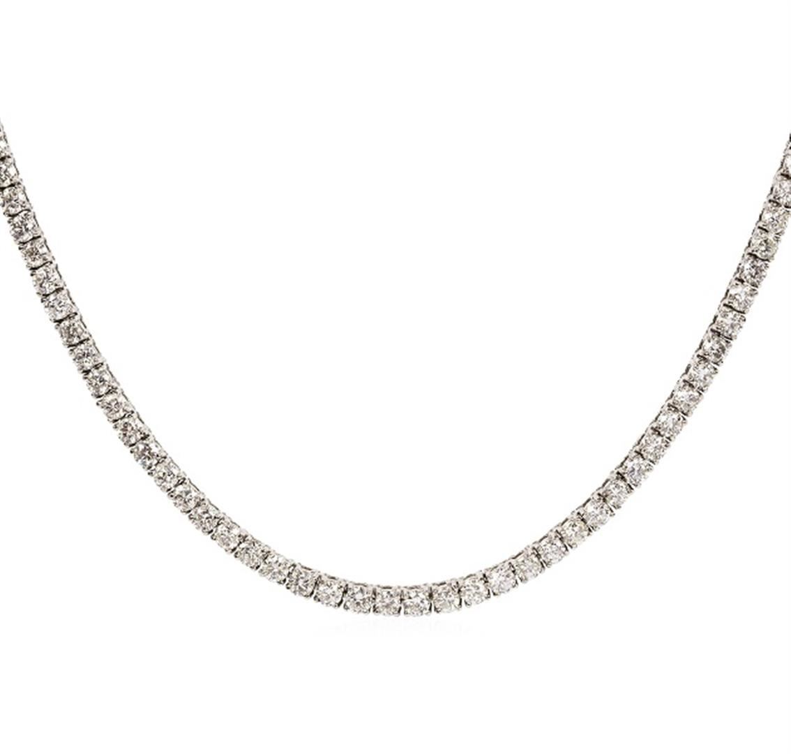 One 18K White Gold Round brilliant cut diamond tennis necklace. Containing (300) round brilliant cut diamonds with a total approximate weight of 21.00 cts., Clarity: VS1-SI1, Color: F-G. The necklace is cast stamped "18K" and has a gross weight of 39.7 grams. GGA Appraised.