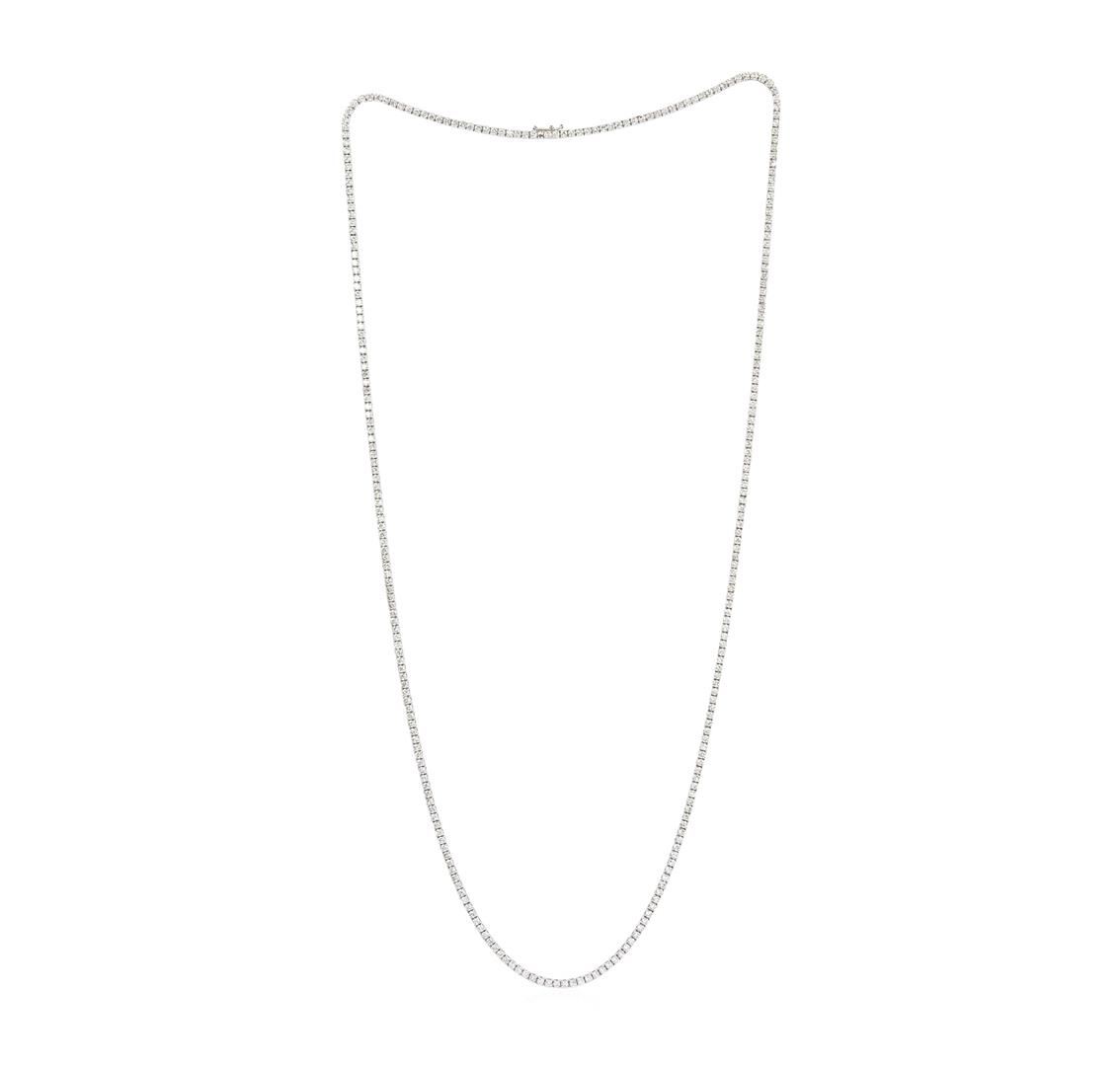 One 18K White Gold Round brilliant cut diamond tennis necklace. Containing (300) round brilliant cut diamonds with a total approximate weight of 21.00 cts., Clarity: VS1-SI1, Color: F-G. The necklace is cast stamped "18K" and has a gross weight of 39.7 grams. GGA Appraised.