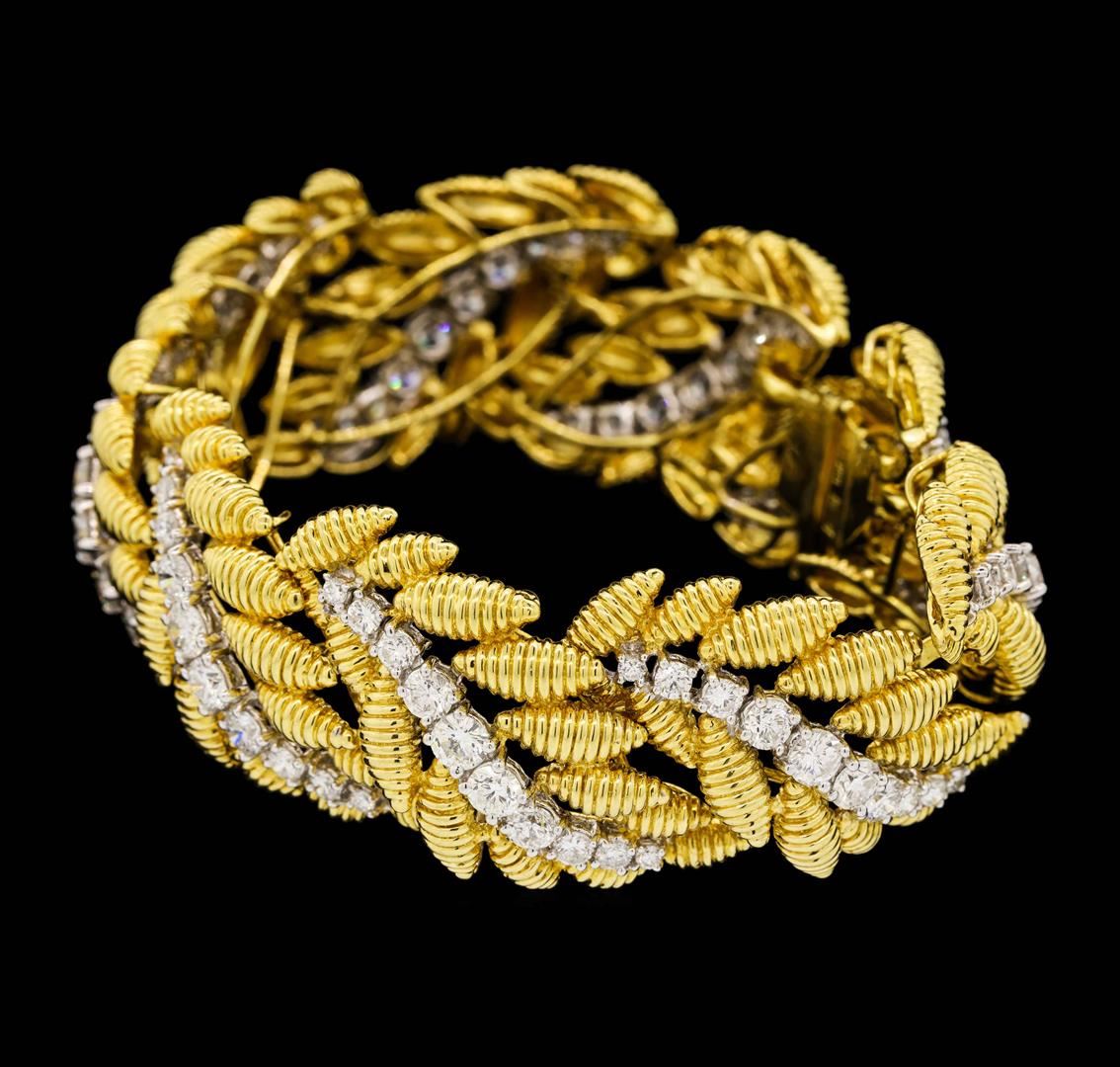 One electronically tested 18KT yellow and white gold lady's combination cast & assembled fashion floral design bracelet with a tongue clasp with fold over safety with a bright polish finish. The featured lady's bracelet measures approximately seven and a half inches in length. Identified with markings of "18K". Condition is new, good workmanship. Containing: Eighteen prong set round brilliant cut diamonds, measuring 4.00 - 3.90 x 2.30mm (depth est.) approximate total weight of 18 Stones = 3.90ct. Graded in the setting. Color F - G, Clarity VS-2 to SI-1 Cut Very Good Eighteen prong set round brilliant cut diamonds, measuring 3.60 - 3.50 x 2.10mm (depth est.) approximate total weight of 18 Stones = 2.90ct. Graded in the setting. Color G - H, Clarity SI-1 to SI-2 Cut Good Thirty-Six prong set round brilliant cut diamonds, measuring 2.70 - 2.50 x 1.56mm (depth est.) approximate total weight of 36 Stones = 2.30ct. Graded in the setting. Color G - H, Clarity SI-1 to SI-2 Cut Good Eighteen prong set round brilliant cut diamonds, measuring 2.00 - 1.90 x 1.21mm (depth est.) approximate total weight of 18 Stones = 0.50ct. Graded in the setting. Color G - H, Clarity SI-1 to SI-2 Cut Good. Total Weight of Diamonds 9.60ct. Total Weight of Bracelet 90.20gm. GAS Appraised.