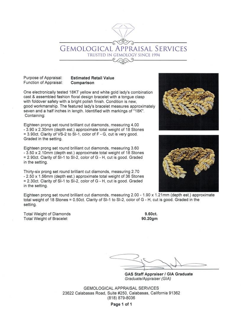 One electronically tested 18KT yellow and white gold lady's combination cast & assembled fashion floral design bracelet with a tongue clasp with fold over safety with a bright polish finish. The featured lady's bracelet measures approximately seven and a half inches in length. Identified with markings of "18K". Condition is new, good workmanship. Containing: Eighteen prong set round brilliant cut diamonds, measuring 4.00 - 3.90 x 2.30mm (depth est.) approximate total weight of 18 Stones = 3.90ct. Graded in the setting. Color F - G, Clarity VS-2 to SI-1 Cut Very Good Eighteen prong set round brilliant cut diamonds, measuring 3.60 - 3.50 x 2.10mm (depth est.) approximate total weight of 18 Stones = 2.90ct. Graded in the setting. Color G - H, Clarity SI-1 to SI-2 Cut Good Thirty-Six prong set round brilliant cut diamonds, measuring 2.70 - 2.50 x 1.56mm (depth est.) approximate total weight of 36 Stones = 2.30ct. Graded in the setting. Color G - H, Clarity SI-1 to SI-2 Cut Good Eighteen prong set round brilliant cut diamonds, measuring 2.00 - 1.90 x 1.21mm (depth est.) approximate total weight of 18 Stones = 0.50ct. Graded in the setting. Color G - H, Clarity SI-1 to SI-2 Cut Good. Total Weight of Diamonds 9.60ct. Total Weight of Bracelet 90.20gm. GAS Appraised.