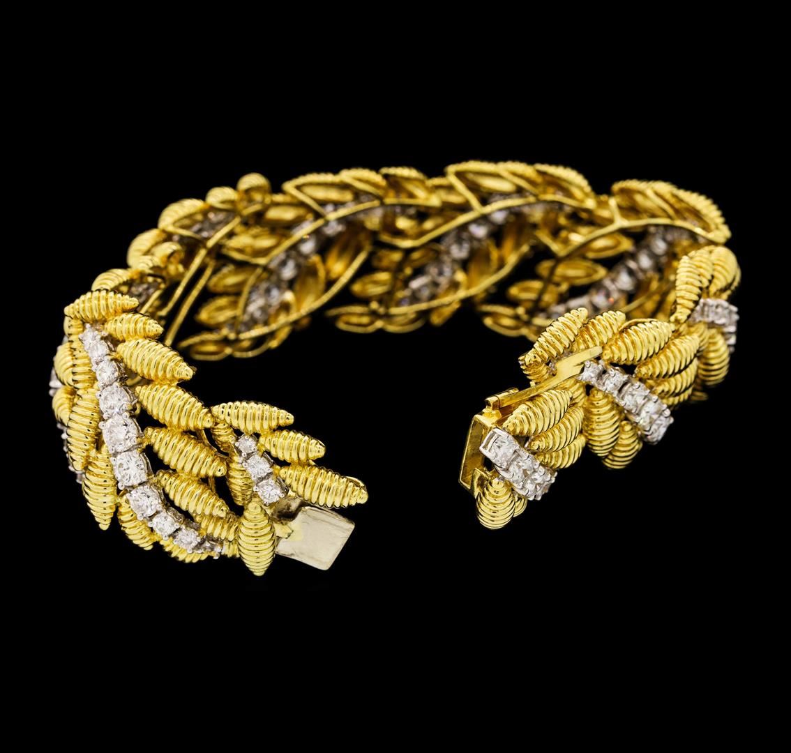 One electronically tested 18KT yellow and white gold lady's combination cast & assembled fashion floral design bracelet with a tongue clasp with fold over safety with a bright polish finish. The featured lady's bracelet measures approximately seven and a half inches in length. Identified with markings of "18K". Condition is new, good workmanship. Containing: Eighteen prong set round brilliant cut diamonds, measuring 4.00 - 3.90 x 2.30mm (depth est.) approximate total weight of 18 Stones = 3.90ct. Graded in the setting. Color F - G, Clarity VS-2 to SI-1 Cut Very Good Eighteen prong set round brilliant cut diamonds, measuring 3.60 - 3.50 x 2.10mm (depth est.) approximate total weight of 18 Stones = 2.90ct. Graded in the setting. Color G - H, Clarity SI-1 to SI-2 Cut Good Thirty-Six prong set round brilliant cut diamonds, measuring 2.70 - 2.50 x 1.56mm (depth est.) approximate total weight of 36 Stones = 2.30ct. Graded in the setting. Color G - H, Clarity SI-1 to SI-2 Cut Good Eighteen prong set round brilliant cut diamonds, measuring 2.00 - 1.90 x 1.21mm (depth est.) approximate total weight of 18 Stones = 0.50ct. Graded in the setting. Color G - H, Clarity SI-1 to SI-2 Cut Good. Total Weight of Diamonds 9.60ct. Total Weight of Bracelet 90.20gm. GAS Appraised.