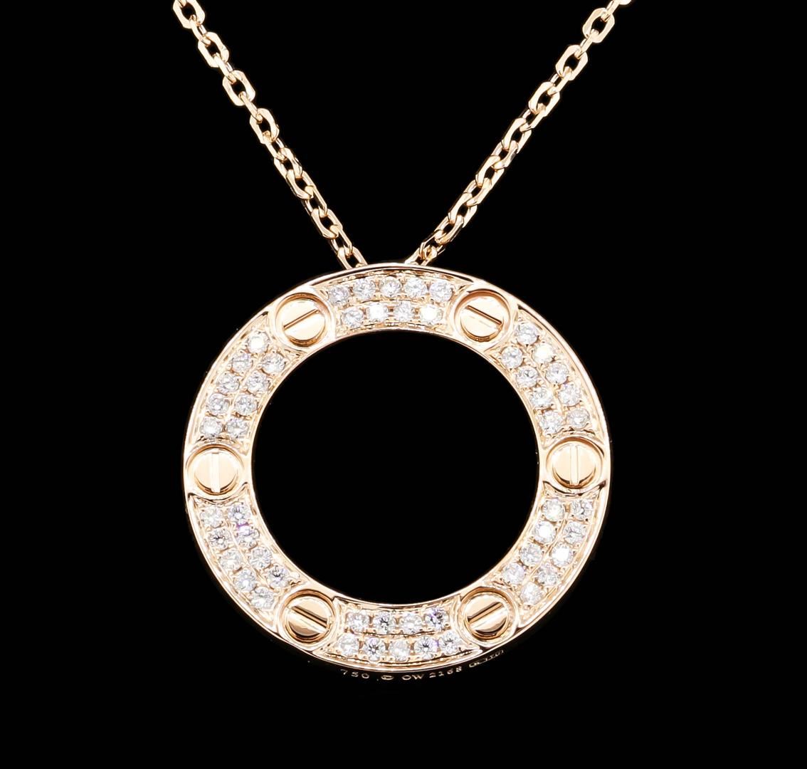 One electronically tested 18KT rose gold lady's cast fashion circle pendant & chain 16.0" long, 1.4mm diamond cut cable link with a lobster claw clasp with a bright polish finish. The featured pendant has the word "LOVE" engraved on the reverse. Identified with markings of "750". Condition is new, good workmanship. Containing: Fifty-Four prong set round brilliant cut diamonds, measuring 1.50 - 1.40 x 0.90mm (depth est.) approximate total weight of 54 Stones = 0.62ct. Graded in the setting. Clarity: VS-2 to SI-1. Color: F - GCut Very Good. Total Weight of Diamonds 0.62ct. Total Weight of Pendant & Chain 12.90gm. GAS Appraised.