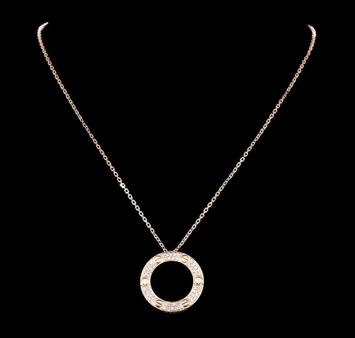 One electronically tested 18KT rose gold lady's cast fashion circle pendant & chain 16.0" long, 1.4mm diamond cut cable link with a lobster claw clasp with a bright polish finish. The featured pendant has the word "LOVE" engraved on the reverse. Identified with markings of "750". Condition is new, good workmanship. Containing: Fifty-Four prong set round brilliant cut diamonds, measuring 1.50 - 1.40 x 0.90mm (depth est.) approximate total weight of 54 Stones = 0.62ct. Graded in the setting. Clarity: VS-2 to SI-1. Color: F - GCut Very Good. Total Weight of Diamonds 0.62ct. Total Weight of Pendant & Chain 12.90gm. GAS Appraised.