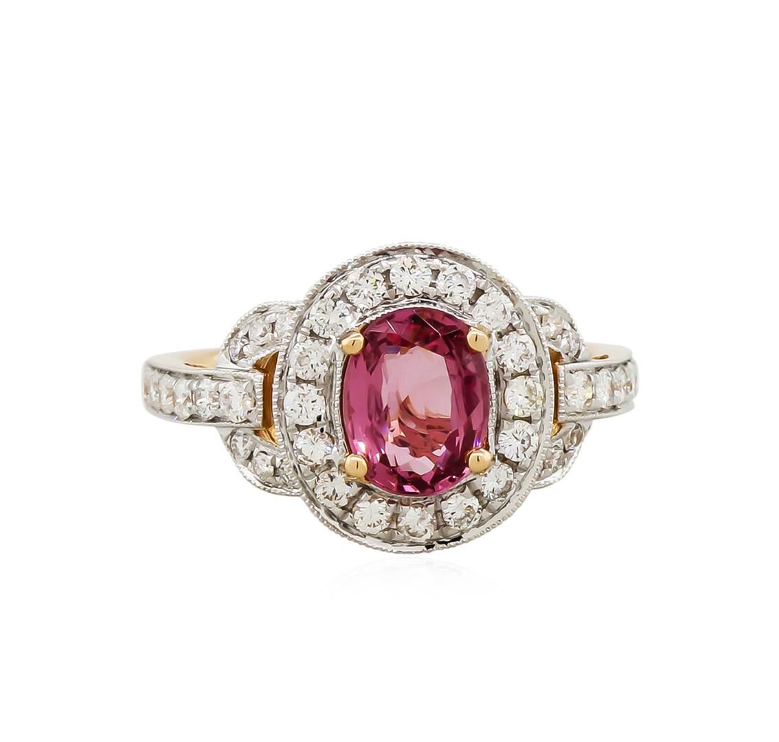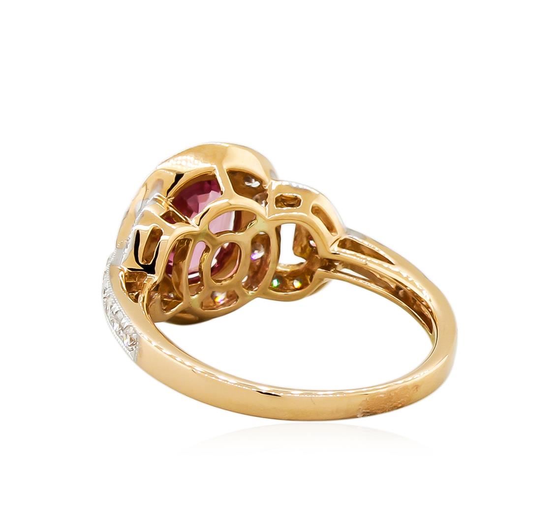 One spinel and diamond ring featuring 3.50grams 18KT Rose Gold and a 1.28 carat spinel center-stone surrounded by forty round diamonds totaling 0.63 carats.
