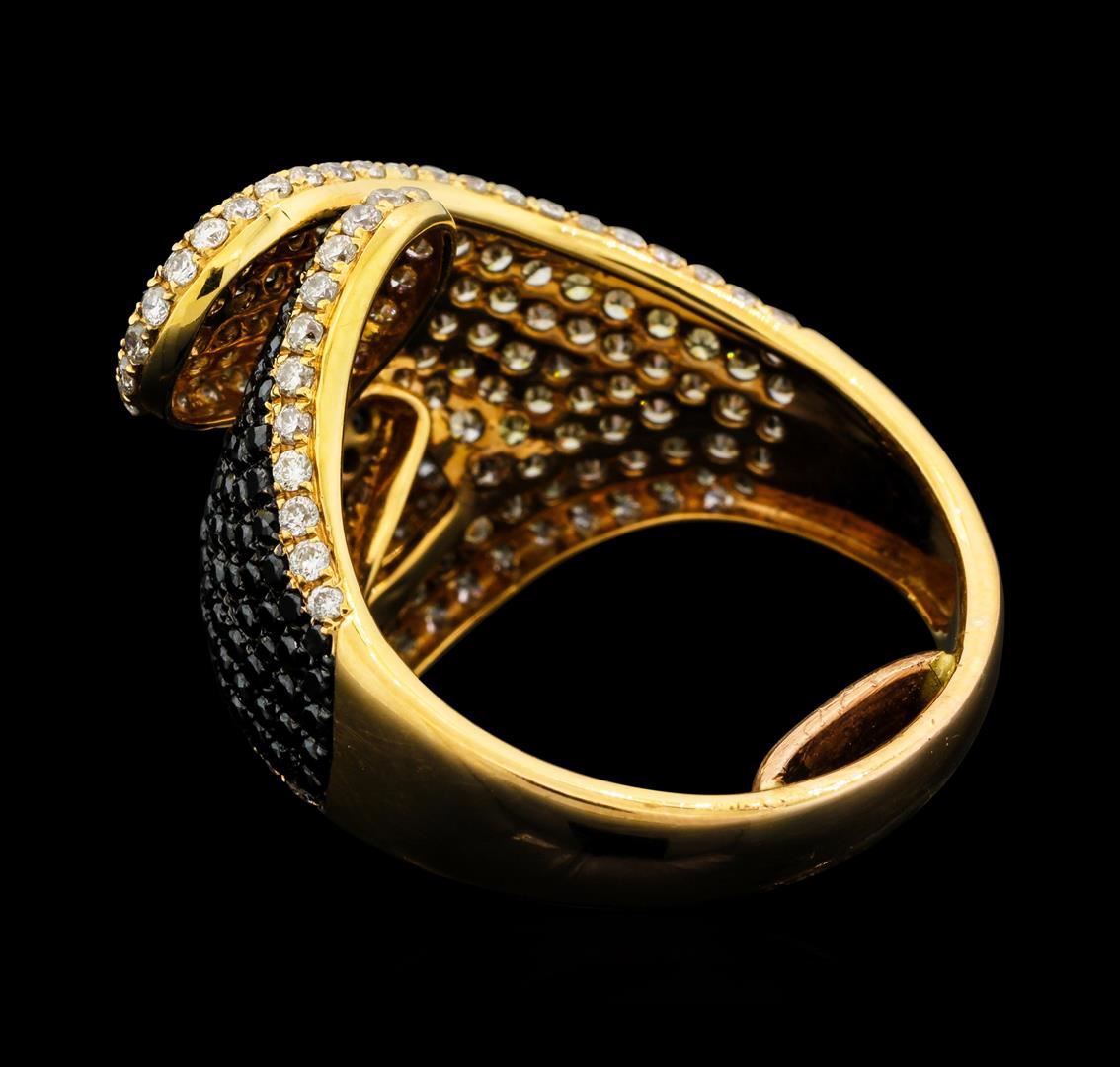 One electronically tested 18KT rose gold lady's combination cast & assembled fashion ring with a freeform crossover shank with a bright polish finish. The featured lady's ring has a soldered on sizing bar and a shank measuring 3.00 millimeters wide. Identified with markings of "18K 750". Condition is like new, good workmanship. Containing: One Hundred Ten prong set round brilliant cut diamonds, measuring 1.20 - 1.05 x 0.68mm (depth est.) approximate total weight of 110 Stones = 0.58ct. Colored gemstones are presumed to have been subjected to commonly used enhancement processes. Graded in the setting.Cut Good One Hundred Seventeen prong set round brilliant cut diamonds, measuring 1.20 - 1.05 x 0.70mm (depth est.) approximate total weight of 117 Stones = 0.64ct. Graded in the setting. Clarity: SI-1 to I-1 Cut Good Eighty-Five prong set round brilliant cut diamonds, measuring 1.20 - 1.05 x 0.70mm (depth est.) approximate total weight of 85 Stones = 0.46ct. Graded in the setting. Clarity: SI-1 to I-1. Color: H - ICut Good. Total Weight of Diamonds 1.68ct. Total Weight of Ring 5.10gm. GAS Appraised.