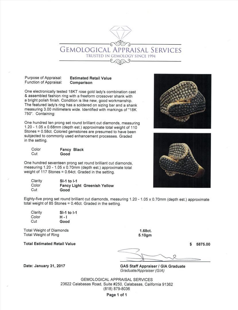 One electronically tested 18KT rose gold lady's combination cast & assembled fashion ring with a freeform crossover shank with a bright polish finish. The featured lady's ring has a soldered on sizing bar and a shank measuring 3.00 millimeters wide. Identified with markings of "18K 750". Condition is like new, good workmanship. Containing: One Hundred Ten prong set round brilliant cut diamonds, measuring 1.20 - 1.05 x 0.68mm (depth est.) approximate total weight of 110 Stones = 0.58ct. Colored gemstones are presumed to have been subjected to commonly used enhancement processes. Graded in the setting.Cut Good One Hundred Seventeen prong set round brilliant cut diamonds, measuring 1.20 - 1.05 x 0.70mm (depth est.) approximate total weight of 117 Stones = 0.64ct. Graded in the setting. Clarity: SI-1 to I-1 Cut Good Eighty-Five prong set round brilliant cut diamonds, measuring 1.20 - 1.05 x 0.70mm (depth est.) approximate total weight of 85 Stones = 0.46ct. Graded in the setting. Clarity: SI-1 to I-1. Color: H - ICut Good. Total Weight of Diamonds 1.68ct. Total Weight of Ring 5.10gm. GAS Appraised at $5,875.00.