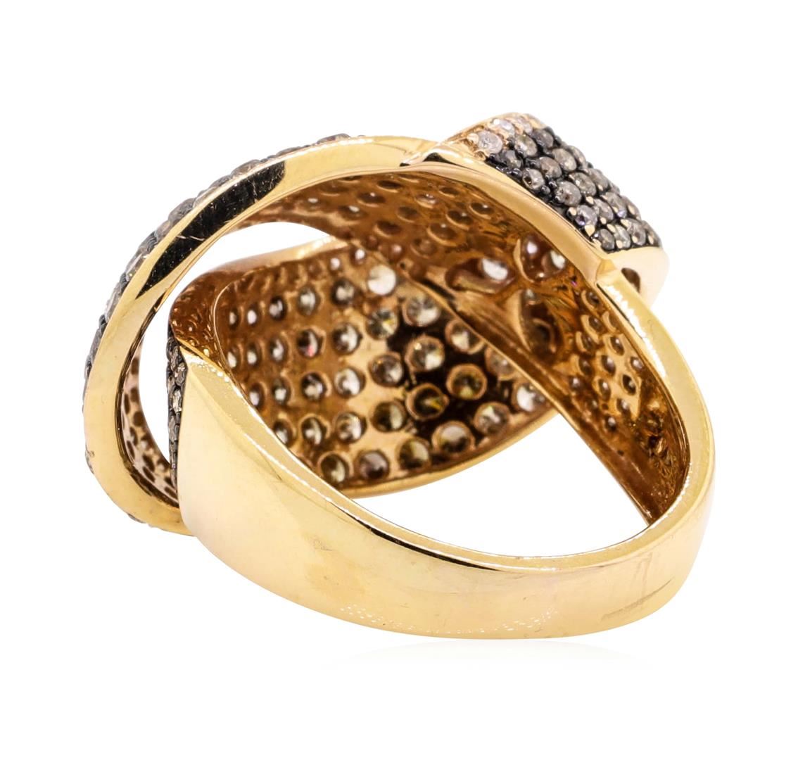 One pair electronically tested 18KT rose gold Ladies cast fashion ribbon ring with a bright polish finish. The featured ladies ring has a shank measuring 3.50 millimeters wide. Identified with markings of '18K 750'. Condition is new, good workmanship. Containing: Two Hundred Sixteen prong set round brilliant cut diamonds, measuring 1.80 - 1.10 x 0.90mm (depth est.) approximate total weight of 216 Stones = 2.62ct. The featured diamonds range in color from fancy light brown to fancy brown to fancy dark brown. Graded in the setting. Color Fancy Brown Clarity SI-1 to I-1 Cut Good Forty-Two prong set round brilliant cut diamonds, measuring 1.15 - 1.10 x 0.68mm (depth est.) approximate total weight of 42 Stones = 0.22ct. Graded in the setting. Color G - H Clarity SI-1 to SI-2 Cut Good. Total Weight of Diamonds 2.84ct.. Total Weight of Ring 8.80gm. GAS Appraised.