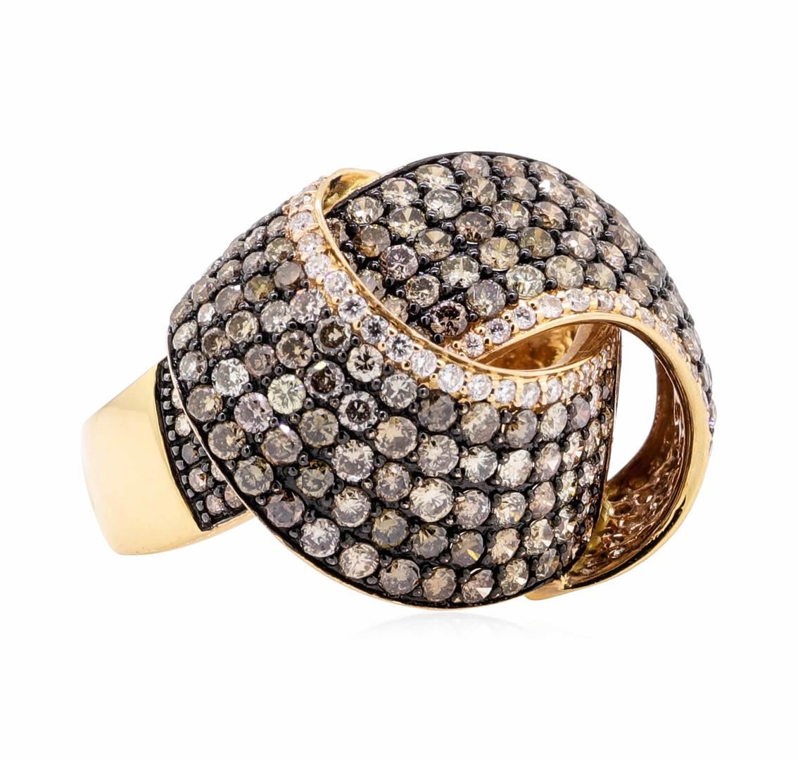 One pair electronically tested 18KT rose gold Ladies cast fashion ribbon ring with a bright polish finish. The featured ladies ring has a shank measuring 3.50 millimeters wide. Identified with markings of '18K 750'. Condition is new, good workmanship. Containing: Two Hundred Sixteen prong set round brilliant cut diamonds, measuring 1.80 - 1.10 x 0.90mm (depth est.) approximate total weight of 216 Stones = 2.62ct. The featured diamonds range in color from fancy light brown to fancy brown to fancy dark brown. Graded in the setting. Color Fancy Brown Clarity SI-1 to I-1 Cut Good Forty-Two prong set round brilliant cut diamonds, measuring 1.15 - 1.10 x 0.68mm (depth est.) approximate total weight of 42 Stones = 0.22ct. Graded in the setting. Color G - H Clarity SI-1 to SI-2 Cut Good. Total Weight of Diamonds 2.84ct.. Total Weight of Ring 8.80gm. GAS Appraised.