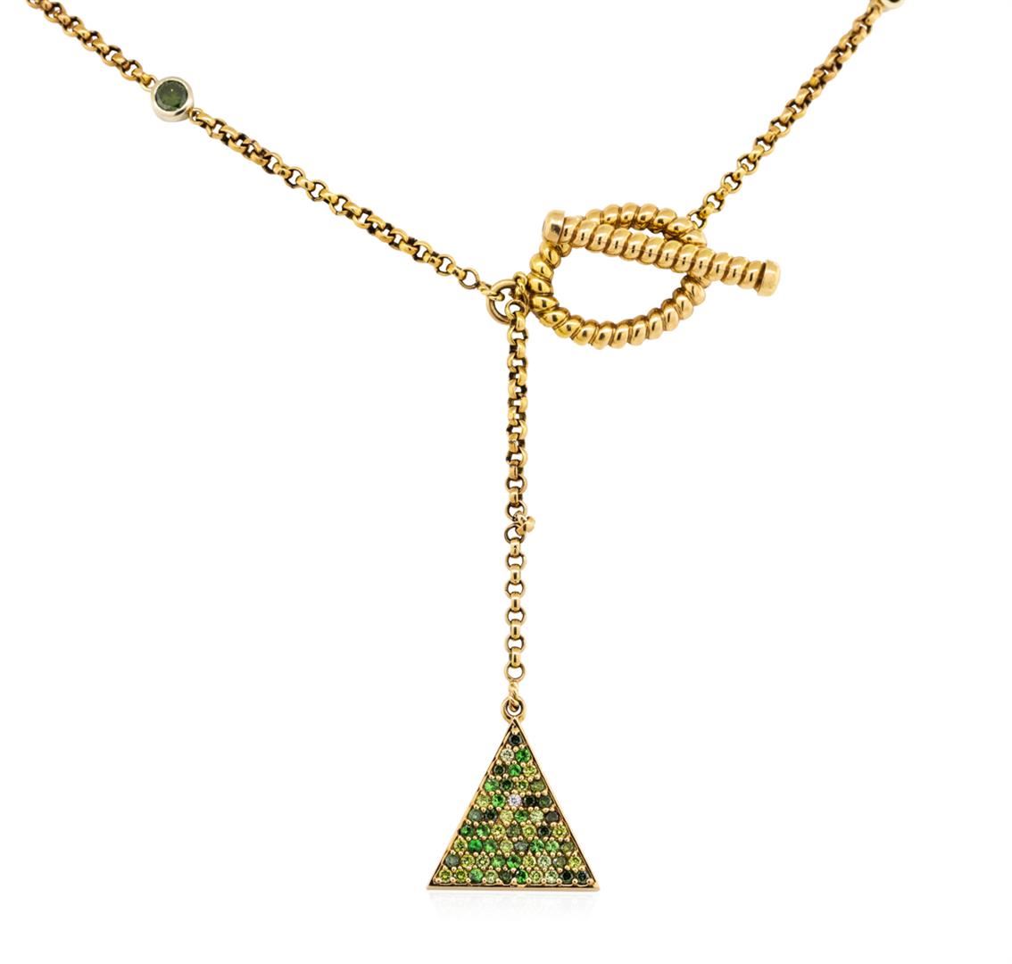 One electronically tested 18KT rose gold lady's combination cast & assembled fashion necklace with a toggle clasp with a bright polish finish. The featured lady's necklace is the True Collection Charm necklace from Misahara and measures approximately sixteen inches in length with a three inch lariat drop. Trademark is Misahara. Identified with markings of '750'. Condition is like new, good workmanship. Containing: One round brilliant cut treated diamond, measuring 5.60 - 5.55 x 3.38mm (depth est.) approximate weight of 0.65ct. Colored gemstones are presumed to have been subjected to commonly used enhancement processes. Graded in the setting. Color Fancy Yellowish Green Clarity SI-1 Eight bezel set round brilliant cut treated diamonds, measuring 3.80 - 3.75 x 2.40mm (depth est.) approximate total weight of 8 Stones = 1.70ct. Colored gemstones are presumed to have been subjected to commonly used enhancement processes. The featured diamonds range in color from fancy green to fancy yellowish green. Graded in the setting. Color Fancy Yellowish Green Clarity VS-2 to SI-1 Cut Very Good Sixteen prong set round brilliant cut treated diamonds, measuring 2.30 - 2.20 x 1.40mm (depth est.) approximate total weight of 16 Stones = 0.70ct. Colored gemstones are presumed to have been subjected to commonly used enhancement processes. The featured diamonds range in color from fancy green to fancy yellowish green. Graded in the setting. Color Fancy Yellowish Green Clarity VS-2 to SI-1 Cut Very Good Fifty-Six prong set round brilliant cut treated diamonds, measuring 1.60 - 1.50 x 0.96mm (depth est.) approximate total weight of 56 Stones = 0.80ct. Colored gemstones are presumed to have been subjected to commonly used enhancement processes. The featured diamonds range in color from fancy greenish yellow to fancy green to fancy yellowish green. Graded in the setting. Color Fancy Yellowish Green Clarity VS-2 to SI-1 Cut Very Good Forty-Eight prong set round brilliant cut treated diamonds, measuring 1.10 - 0.90 x 0.62mm (depth est.) approximate total weight of 48 Stones = 0.18ct. Colored gemstones are presumed to have been subjected to commonly used enhancement processes. Graded in the setting. Color Fancy Greenish Yellow Clarity VS-2 to SI-1 Cut Very Good Seventy-One prong set round brilliant cut diamonds, measuring 1.60 - 1.50 x 0.96mm (depth est.) approximate total weight of 71 Stones = 1.00ct. Graded in the setting. Color G - H Clarity VS-1 to VS-2 Cut Very Good Fifteen prong set round modified mixed cut natural tsavorite garnets, measuring 1.70 - 1.60 x 1.07 mm, (depth est.) approximate total weight of 0.30ct., clarity is eye clean, medium, moderately strong, green color, (GIA G 5/4), cut is good. Transmitting light with no distortion, transparent. Colored gemstones are presumed to have been subjected to commonly used enhancement processes. Graded in the setting. Total Weight of Colored Stones 0.30ct. Total Weight of Diamonds 5.03ct. Total Weight of Necklace 47.80gm. GAS Appraised.