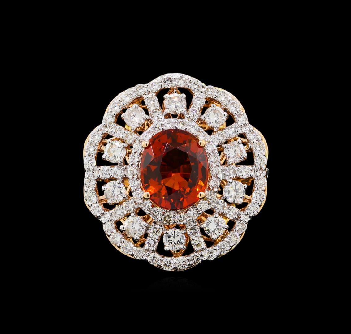 One electronically tested 18KT rose gold lady's cast fashion ring with a double scalloped basket halo with a bright polish finish. The featured lady's ring has a shank measuring 2.58 millimeters in width. Identified with markings of "18K". Condition is new, good workmanship. Containing: One prong set oval modified brilliant cut natural spessartite garnet, measuring 11.00 x 9.18 x 6.44mm, (depth est.) 9%. bulge factor, approximate weight of 6.19ct., clarity is eye clean, medium dark, moderately strong, reddish orange color, (GIA rO 6/4), cut is very good. Transmitting light with no distortion, transparent. Colored gemstones are presumed to have been subjected to commonly used enhancement processes. Graded in the setting.Ten prong set round brilliant cut diamonds, measuring 3.10 - 3.00 x 1.90mm (depth est.) approximate total weight of 10 Stones = 1.08ct. Graded in the setting. Clarity: SI-1 to SI-2. Color: H - ICut Good One Hundred prong set round brilliant cut diamonds, measuring 1.70 - 1.60 x 0.99mm (depth est.) approximate total weight of 100 Stones = 1.66ct. Graded in the setting. Clarity: VS-2 to SI-2. Color: G - HCut Good. Total Weight of Colored Stones 6.19ct. Total Weight of Diamonds 2.74ct. Total Weight of Ring 10.60gm. GAS Appraised.