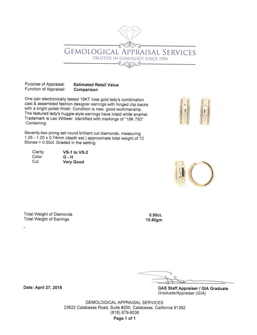 One pair electronically tested 18KT rose gold Ladies combination cast & assembled fashion designer earrings with hinged clip backs with a bright polish finish. The featured Ladies huggie-style earrings have inlaid white enamel. Trademark is Leo Wittwer. Identified with markings of '18K 750'. Condition is new, good workmanship. Containing: Seventy-Two prong set round brilliant cut diamonds, measuring 1.25 - 1.20 x 0.74mm (depth est.) approximate total weight of 72 Stones = 0.50ct. Graded in the setting. Color G - H Clarity VS-1 to VS-2 Cut Very Good. Total Weight of Diamonds 0.50ct.. Total Weight of Earrings 15.80gm. GAS Appraised.