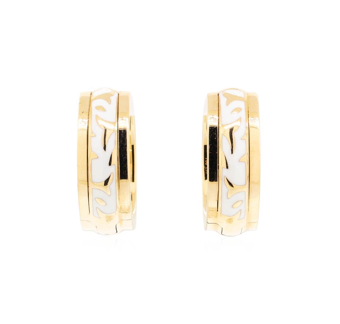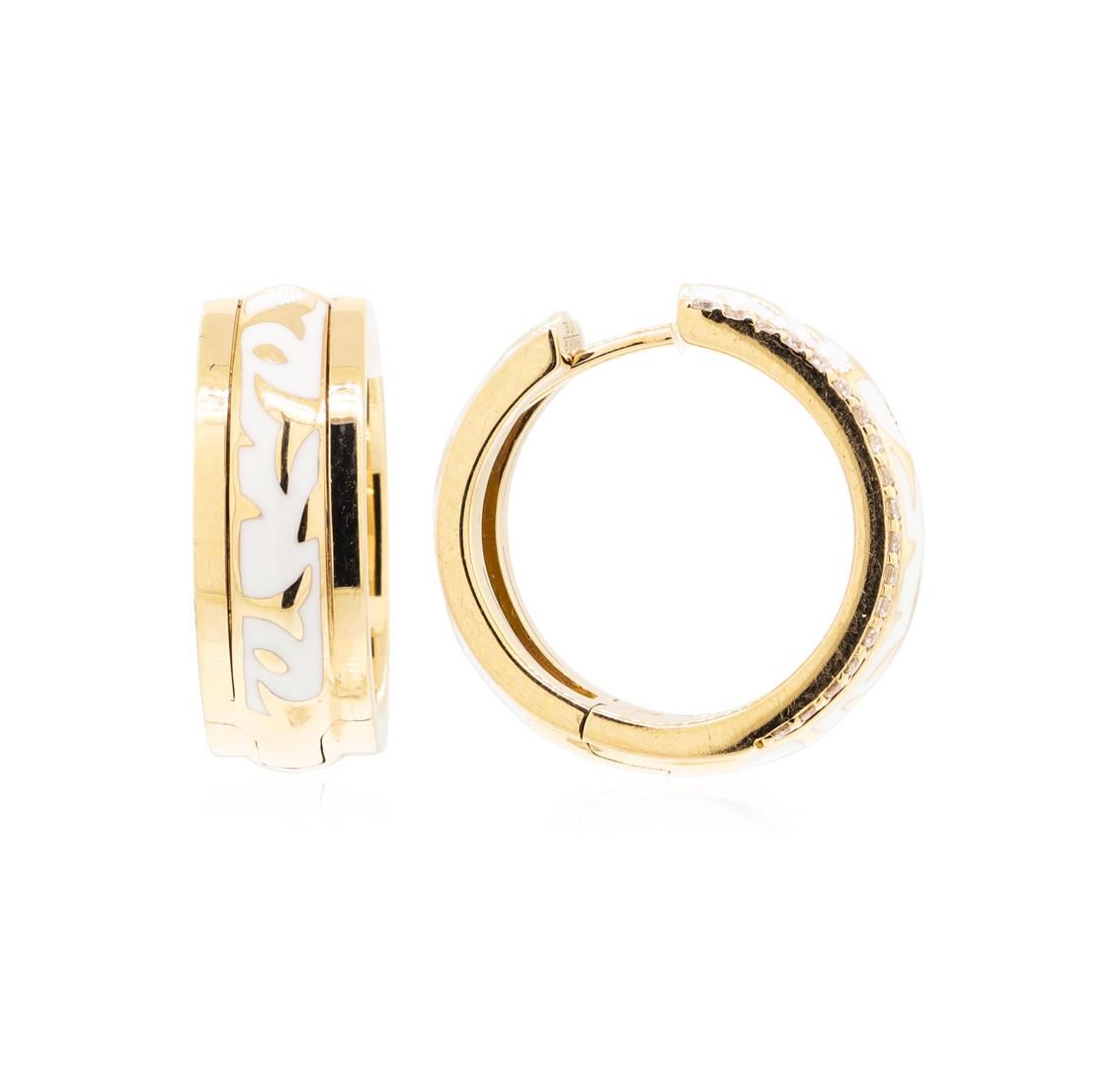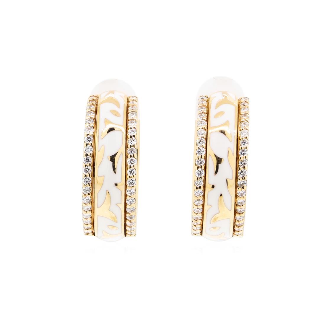 One pair electronically tested 18KT rose gold Ladies combination cast & assembled fashion designer earrings with hinged clip backs with a bright polish finish. The featured Ladies huggie-style earrings have inlaid white enamel. Trademark is Leo Wittwer. Identified with markings of '18K 750'. Condition is new, good workmanship. Containing: Seventy-Two prong set round brilliant cut diamonds, measuring 1.25 - 1.20 x 0.74mm (depth est.) approximate total weight of 72 Stones = 0.50ct. Graded in the setting. Color G - H Clarity VS-1 to VS-2 Cut Very Good. Total Weight of Diamonds 0.50ct.. Total Weight of Earrings 15.80gm. GAS Appraised.