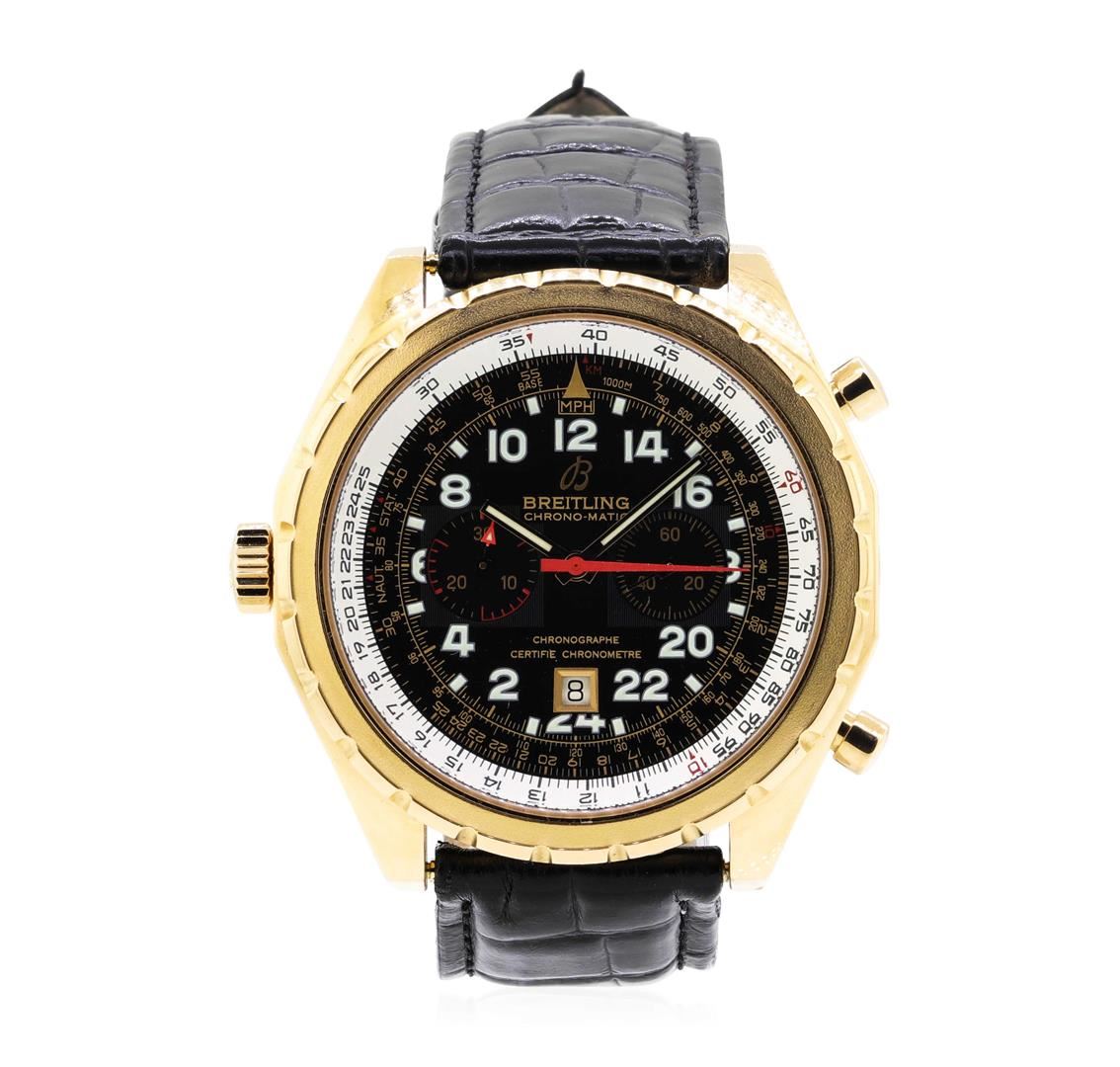 One Men's, hand crafted and machine milled Breitling round case Chrono-Matic wrist watch electronically tested 18KT rose gold, Serial#: 2125366, Crown: pull-out, Bezel: Rose gold, Crystal: synthetic sapphire, Movement: automatic, Dial: black double sub-dial with baton, parallel type hands and Arabic numerals, Calendar: 3 o'clock, Bracelet: leather, Condition: G-6 extra fine. The featured Men's watch is a left-handed watch and measures approximately nine and a half inches in circumference with strap.. Total Weight of Watch 154.50gm. GAS Appraised.