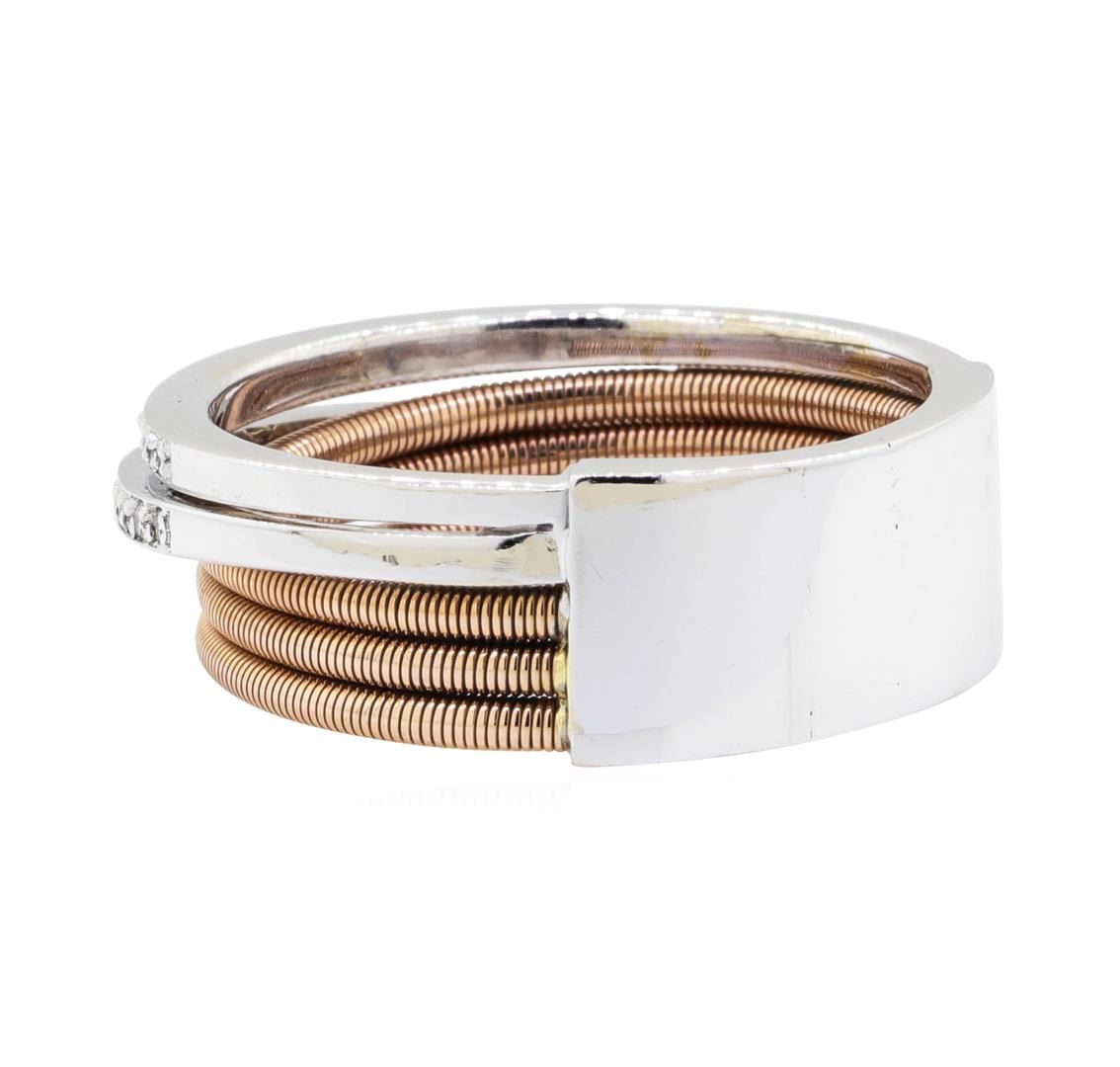 One electronically tested 18KT rose and white gold Ladies combination cast & assembled fashion crossover ring with a bright polish and satin finish. The featured Ladies ring has a shank measuring 8.37 millimeters wide. Identified with markings of '750'. Condition is new, good workmanship. Containing: Forty-Two prong set round brilliant cut diamonds, measuring 1.30 - 1.20 x 0.75mm (depth est.) approximate total weight of 42 Stones = 0.30ct. Graded in the setting. Color G - H Clarity SI-1 to I-1 Cut Good. Total Weight of Diamonds 0.30ct.. Total Weight of Ring 8.80gm. GAS Appraised.