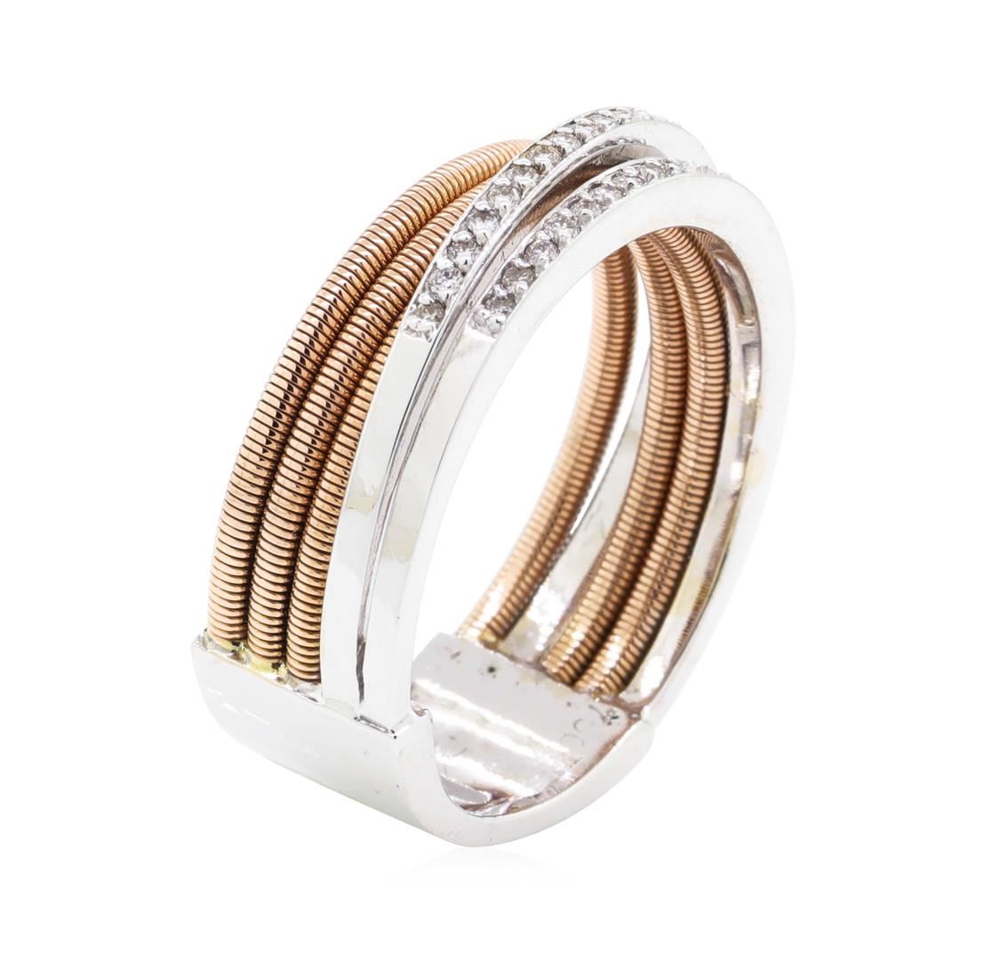 One electronically tested 18KT rose and white gold Ladies combination cast & assembled fashion crossover ring with a bright polish and satin finish. The featured Ladies ring has a shank measuring 8.37 millimeters wide. Identified with markings of '750'. Condition is new, good workmanship. Containing: Forty-Two prong set round brilliant cut diamonds, measuring 1.30 - 1.20 x 0.75mm (depth est.) approximate total weight of 42 Stones = 0.30ct. Graded in the setting. Color G - H Clarity SI-1 to I-1 Cut Good. Total Weight of Diamonds 0.30ct.. Total Weight of Ring 8.80gm. GAS Appraised.