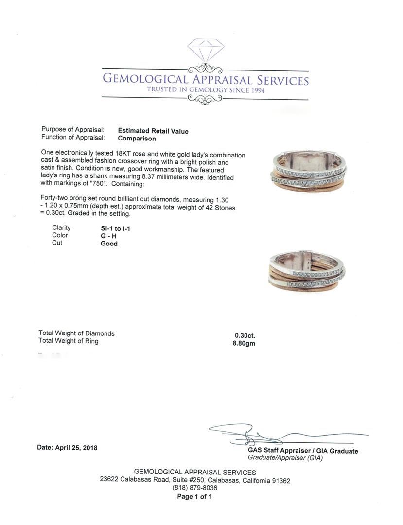 One electronically tested 18KT rose and white gold Ladies combination cast & assembled fashion crossover ring with a bright polish and satin finish. The featured Ladies ring has a shank measuring 8.37 millimeters wide. Identified with markings of '750'. Condition is new, good workmanship. Containing: Forty-Two prong set round brilliant cut diamonds, measuring 1.30 - 1.20 x 0.75mm (depth est.) approximate total weight of 42 Stones = 0.30ct. Graded in the setting. Color G - H Clarity SI-1 to I-1 Cut Good. Total Weight of Diamonds 0.30ct.. Total Weight of Ring 8.80gm. GAS Appraised.