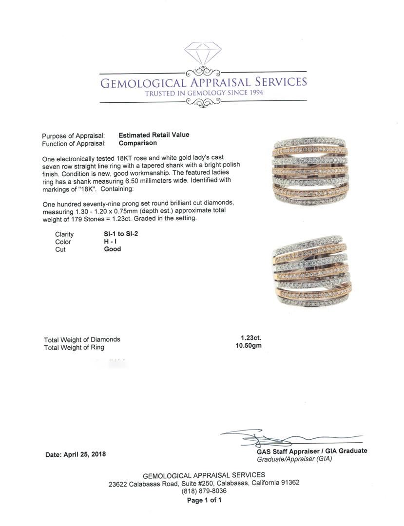 One electronically tested 18KT rose and white gold Ladies cast seven row straight line ring with a tapered shank with a bright polish finish. The featured ladies ring has a shank measuring 6.50 millimeters wide. Identified with markings of '18K'. Condition is new, good workmanship. Containing: One Hundred Seventy-Nine prong set round brilliant cut diamonds, measuring 1.30 - 1.20 x 0.75mm (depth est.) approximate total weight of 179 Stones = 1.23ct. Graded in the setting. Color H - I Clarity SI-1 to SI-2 Cut Good. Total Weight of Diamonds 1.23ct.. Total Weight of Ring 10.50gm. GAS Appraised.
